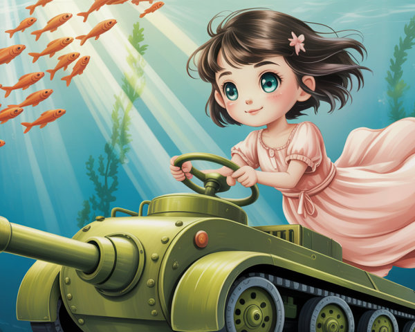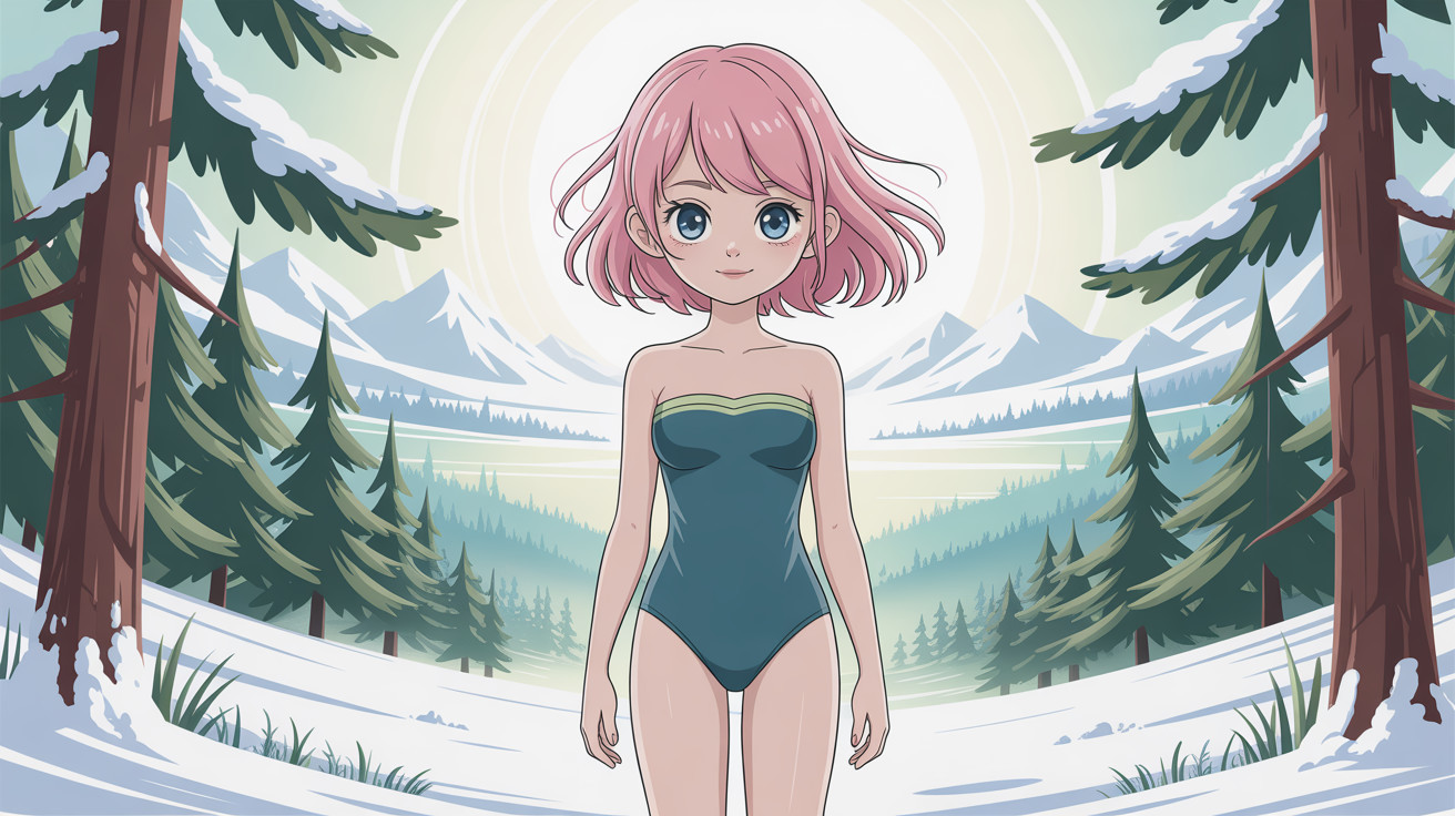 A charming character in a strapless swimsuit enjoys a sunny day in a lush taiga setting, surrounded by vibrant greenery and serene nature, embodying a playful and carefree spirit.