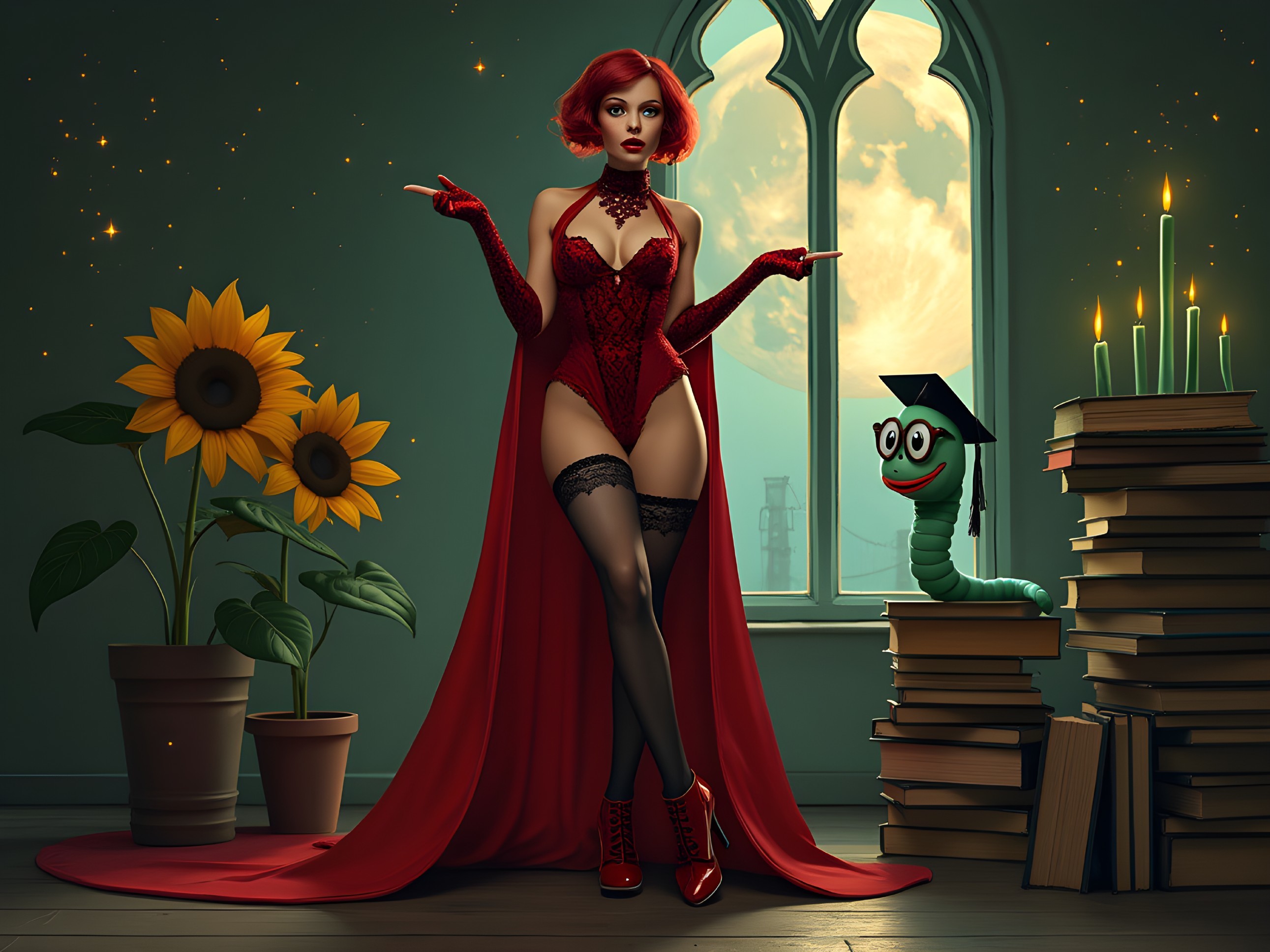 A captivating figure in a red corset and long cape stands confidently in a room adorned with sunflowers. A scholarly worm peeks from a stack of books, while a glowing moon shines outside.