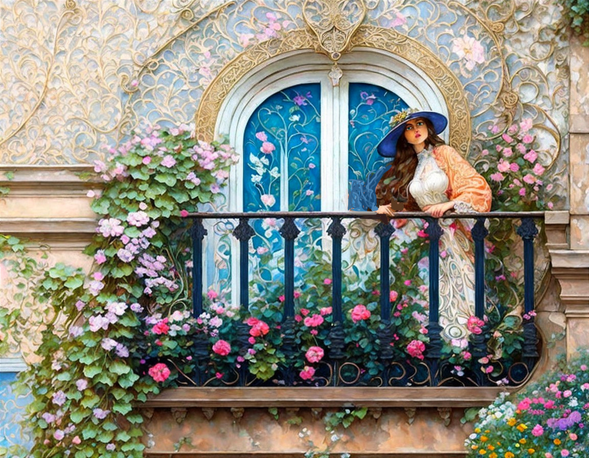 Prompt: Art Nouveau. Woman in a hat on the balcony of an old decorated stone house, curved wrought iron railing, flower troughs, geraniums, flowers, intricate, ultra detailed, high definition, colourful, ornate, quilling, watercolor, wet ink, Gustav Klimt, Alphonse Mucha,