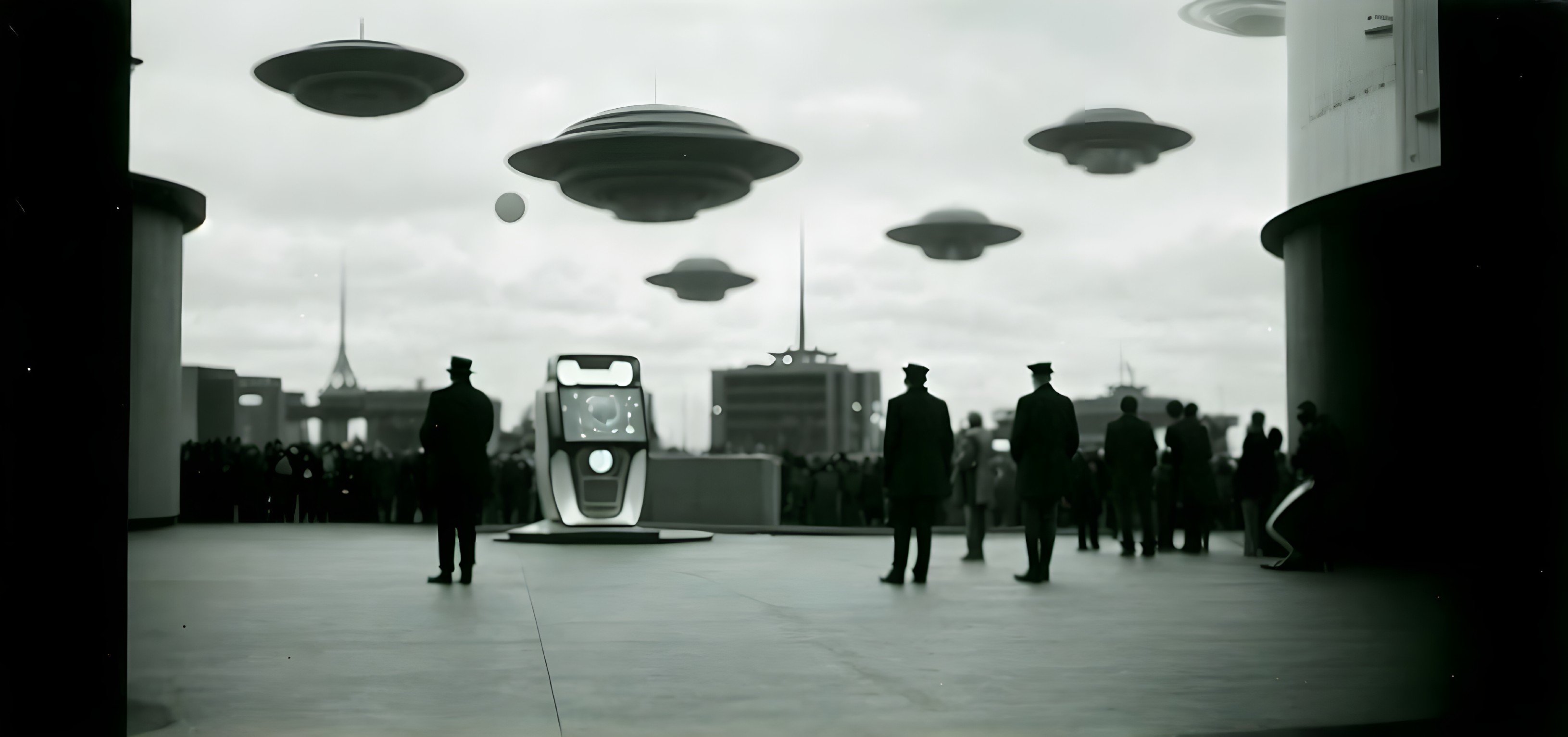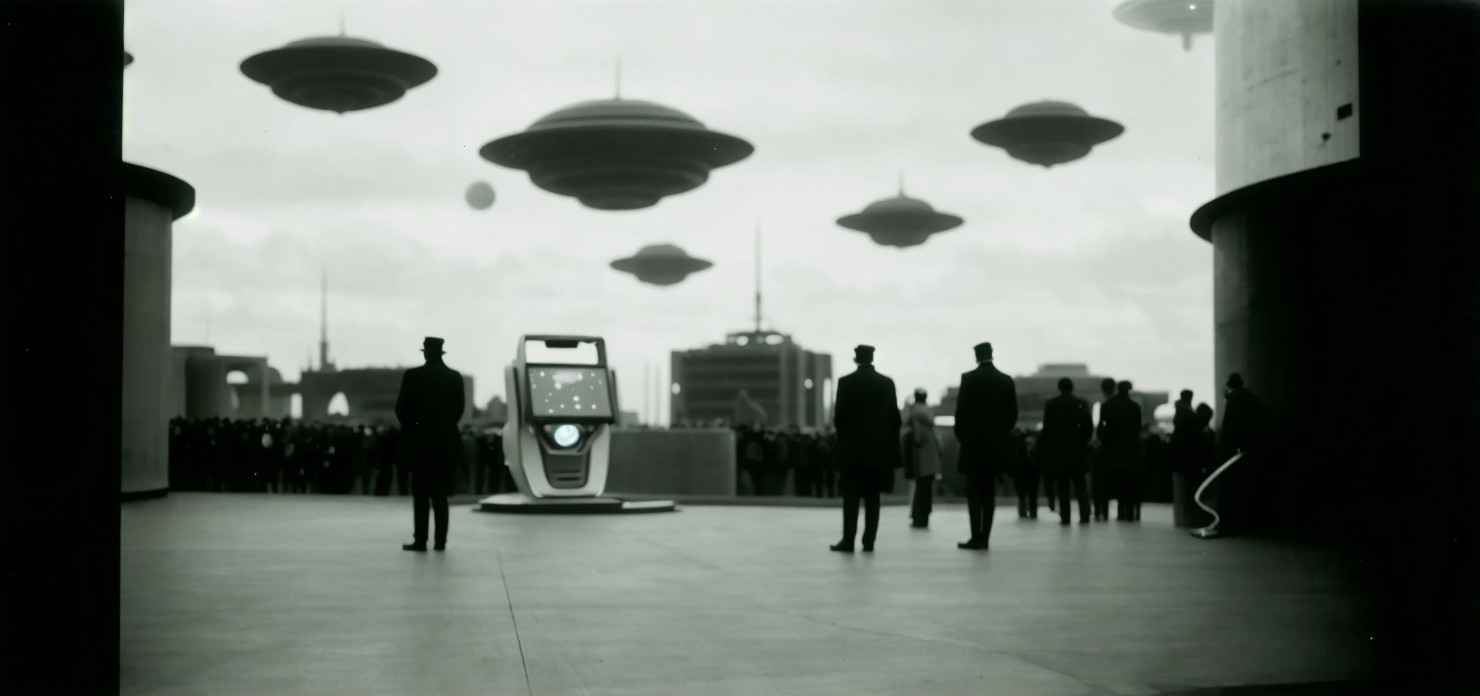 + Prompt:People watching a big view screen with an older man talking, spaceships hoovering in the sky, retrofuturistic concrete buildings, huge planet Saturn visible, orbital ring, moons visible, stars visible, retrofuturism, retrofuturistic, daguerreotype, melancholie, science fiction, sci-fi, 1930s look