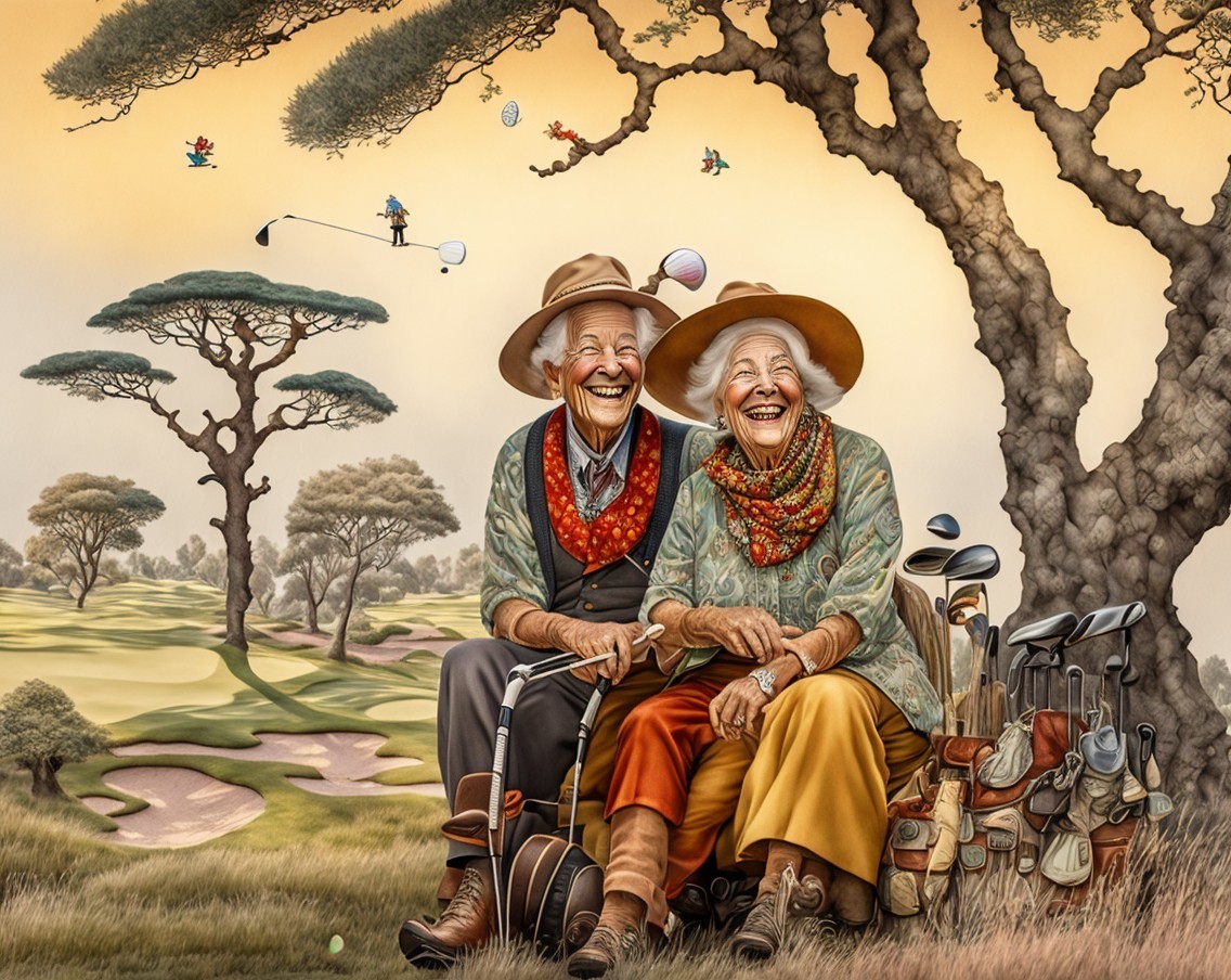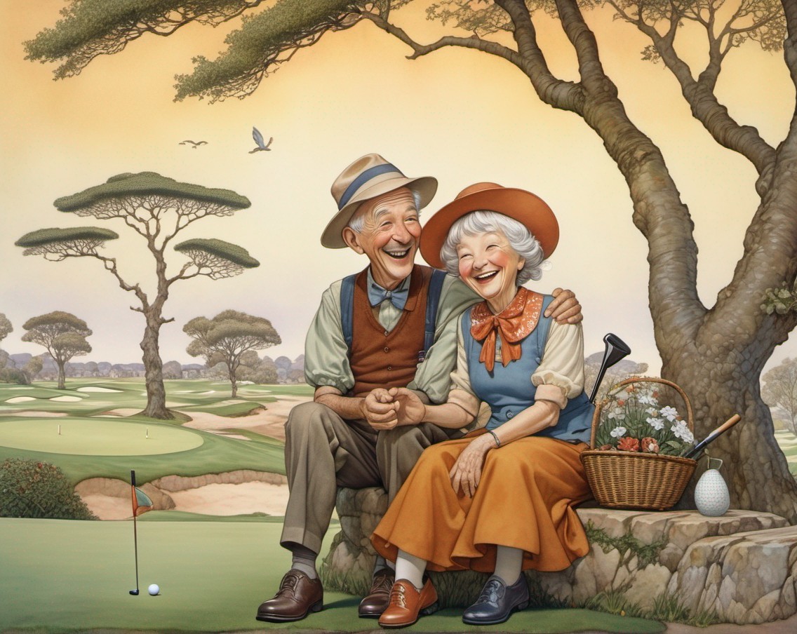 An elderly couple with golf equipment laugh joyfully on a sunny golf course with lush trees and rocky mountains in the background.