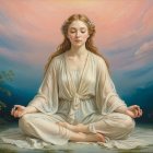 A serene figure in a flowing white gown, seated in meditation on a tranquil lake, surrounded by vibrant flowers and gentle clouds, bathed in soft, ethereal light.