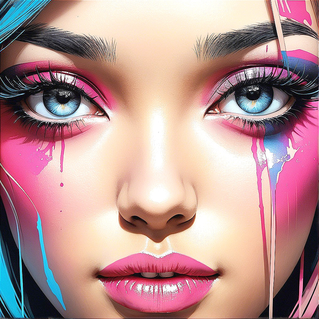 The image features a close-up portrait of a young woman with striking blue eyes and vibrant makeup, including bold pink and blue accents, exuding a captivating, modern artistic flair.