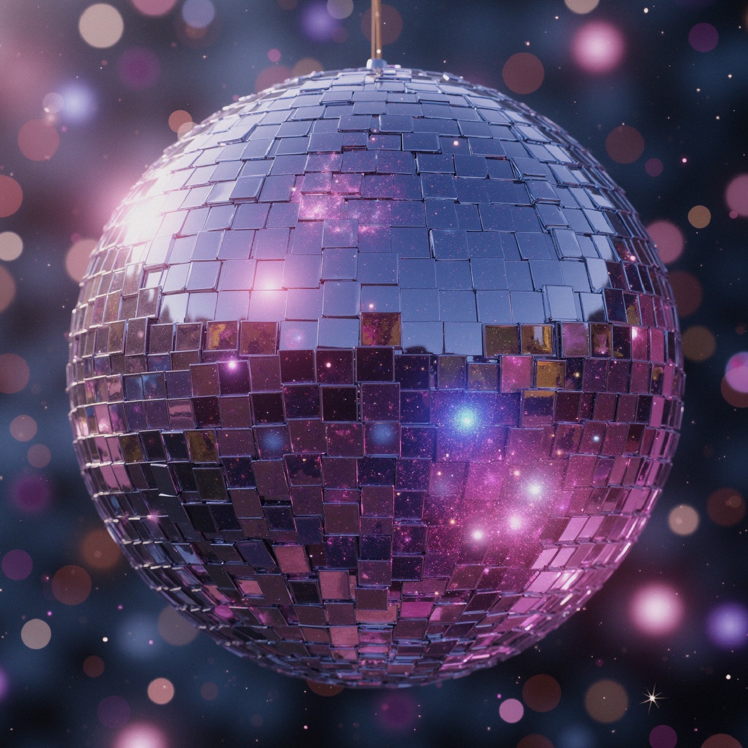 A shimmering disco ball rests on a reflective surface, surrounded by sparkling lights and colorful bokeh. The scene exudes a vibrant, festive atmosphere filled with energy and joy.