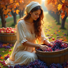 A woman with long red hair sits beside a basket overflowing with chestnuts, wearing a light jacket. A fluffy dog rests nearby, surrounded by colorful autumn foliage lining a serene path.