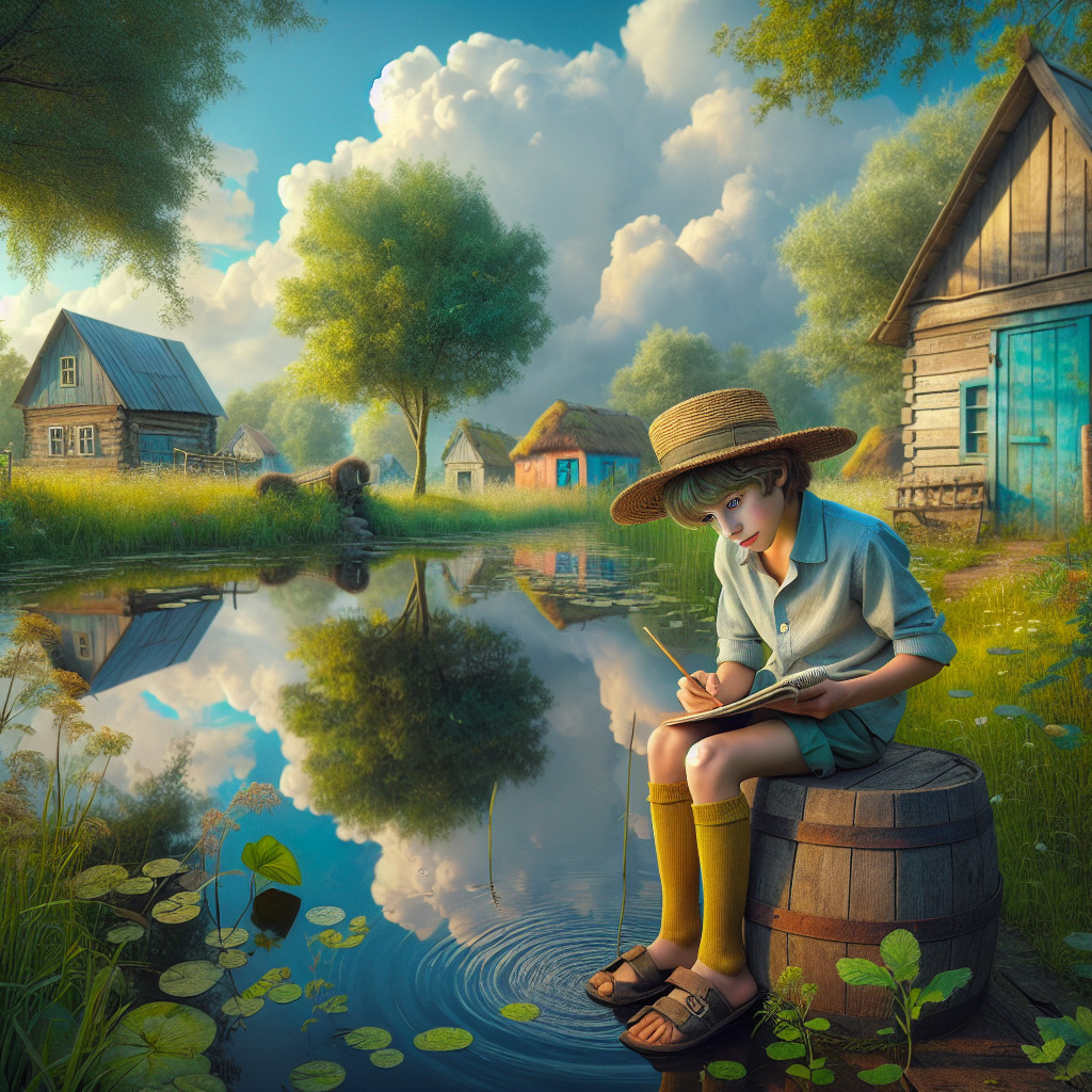 Prompt: A serene scene depicting a young boy sitting on a wooden barrel at a tranquil pond, surrounded by the lush greenery of a rural village. The boy, wearing a straw hat, a light blue shirt, and yellow socks, is intently writing in a notebook. In the background, there's a rustic wooden house with a slanted roof and colorful cottages peeking through the vibrant foliage. Soft sunlight filters through the clouds, casting a magical glow over the tranquil water, which reflects the surroundings and features ripples from gently falling raindrops.