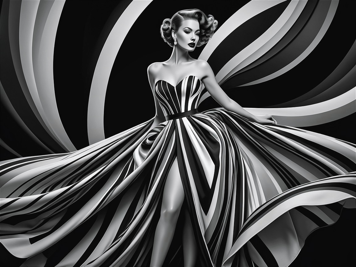 A striking black-and-white fashion illustration features a model in a stunning strapless gown adorned with bold swirling stripes, exuding elegance and movement against a dynamic background.