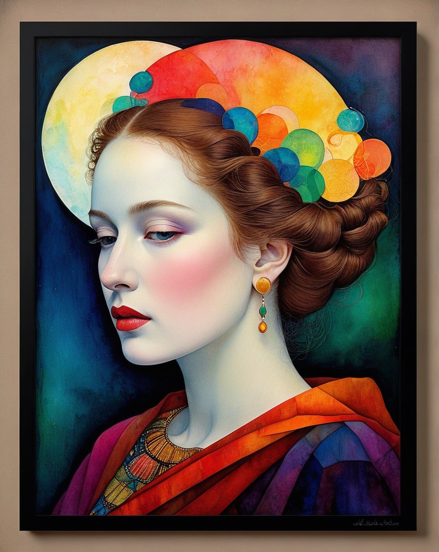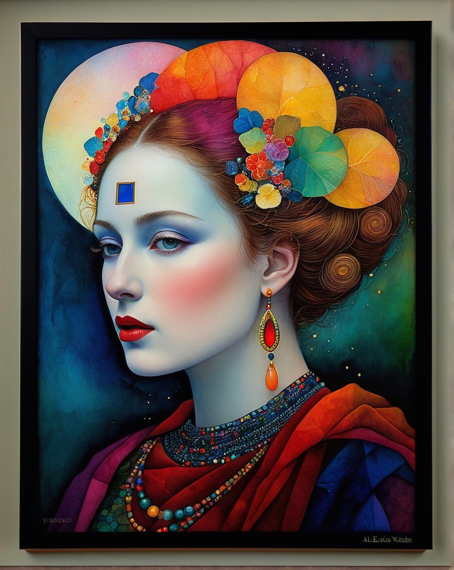 The image depicts a striking woman with delicate features, adorned in vibrant colors and intricate jewelry, against a colorful, abstract background, exuding elegance and sophistication.