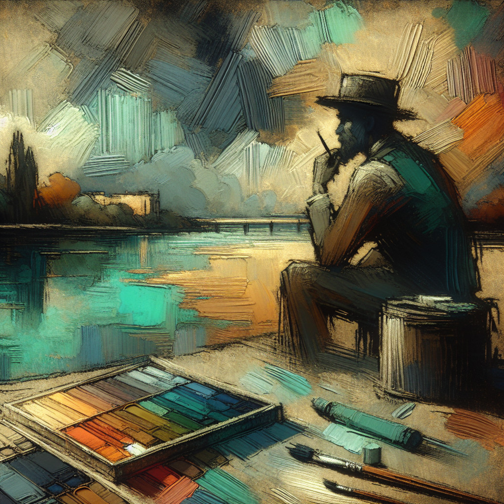 Prompt: Charcoal and colored chalk sketch, minimalist expressionism, layered textural strokes, visible granular texture; a figurative abstract, a portrait of a visionary artist contemplating a river; a subdued moody palette, deep color saturation; Gleizes, Schiele, Bilal, Redon,