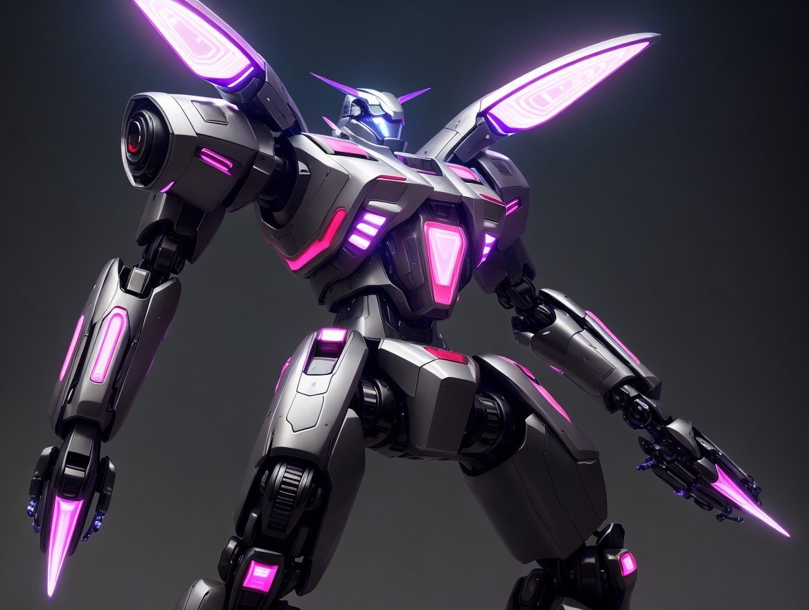 A sleek, futuristic robot stands poised, featuring vibrant pink accents and large, wing-like structures. Its metallic body showcases a blend of technology and artistry, exuding an air of power.