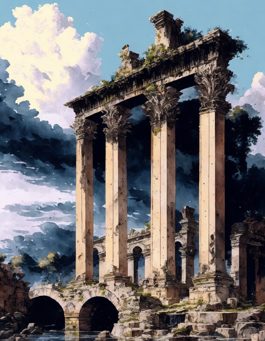 Ancient ruins with tall columns and lush vegetation near waterfalls.