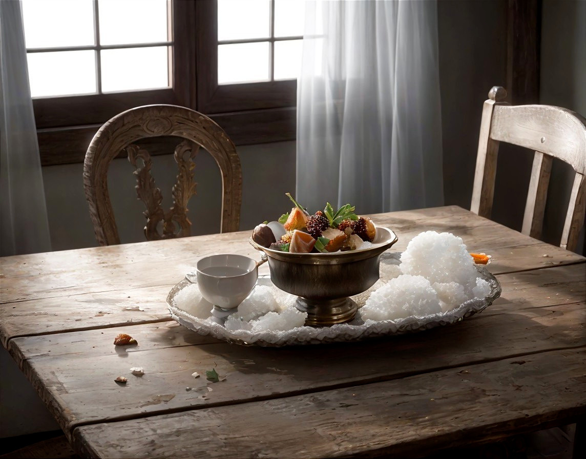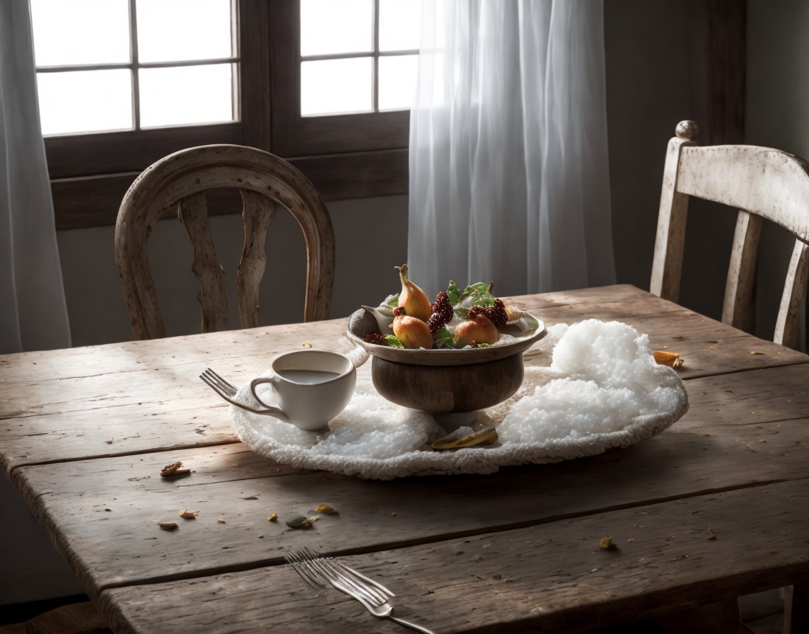 A rustic wooden table features a bowl of fresh fruit surrounded by fluffy rice served on an ornate platter, with a cup of sauce beside it, illuminated by soft natural light.