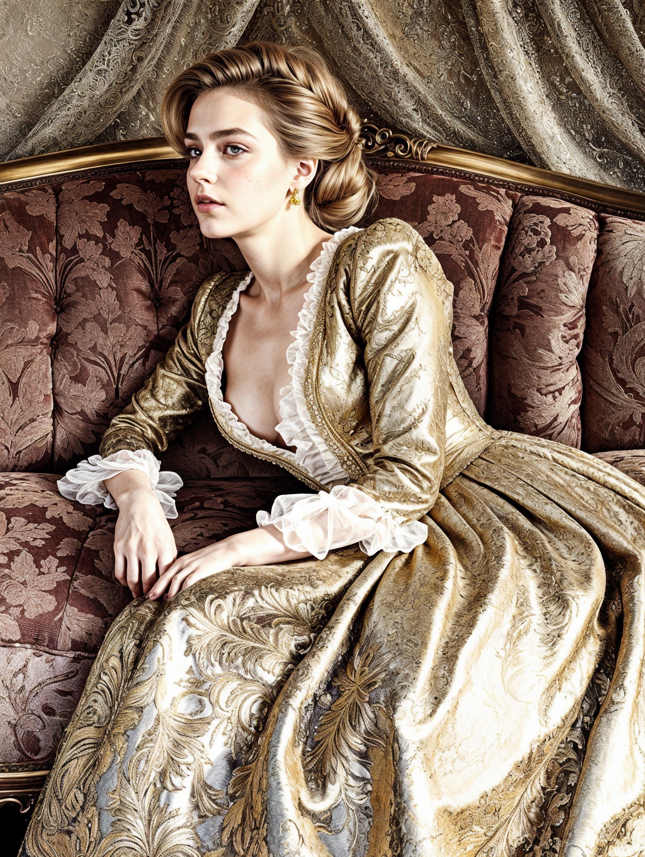 A young woman in a luxurious golden gown with a fitted bodice and puffed sleeves sits elegantly on a richly upholstered couch, surrounded by opulent decor and soft, golden lighting.