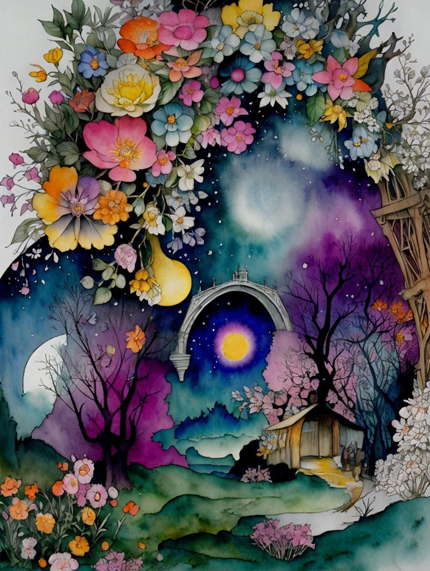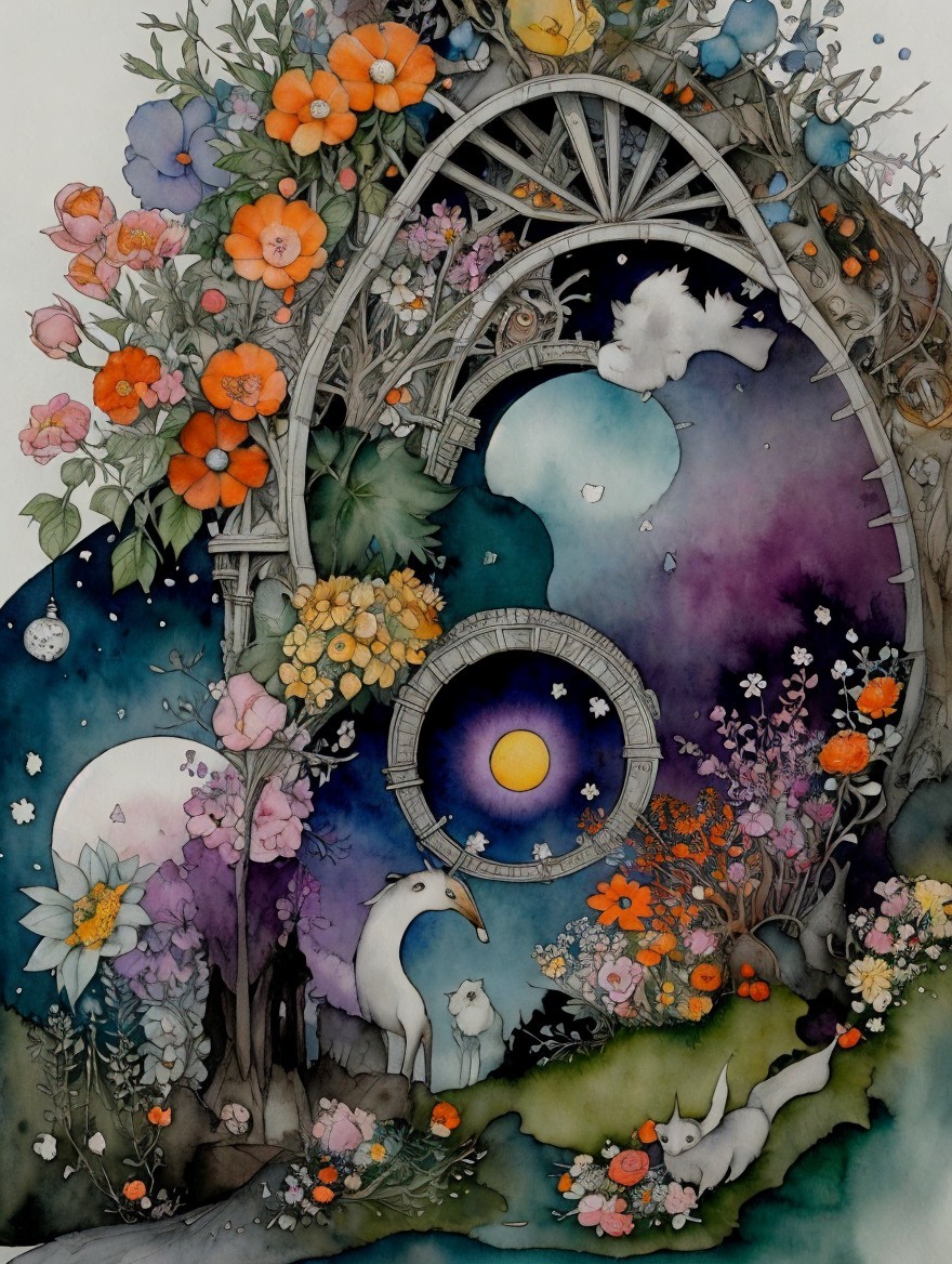 Hieronymus Bosch, kandinski,precise lineart,Line art watercolor wash, cartoon style, . in A watercolor painting a sketch of a Bridge in the Mist landscape composed of flowers sprouting among freshly fallen snow, jewel-tone colors in shades of green, blue, orange and yellow, modifiers: elegant and highly detailed pencil drawing by Arthur Rackham, Jean-Baptiste Monge, Shabby Chic Japanese watercolor, watercolor painting, oil painting, bold strokes, paint drips, oil painting, bold strokes, dripping paint, engine unreal, greg rutkowski, loish, rhads, beeple, makoto shinkai and lois van baarle, ilya kuvshinov, rossdraws, tom bagshaw, alphonse Mucha, global illumination, intricate and detailed environment, Broken Glass effect, no background, stunning, something that even doesn't exist, mythical being, energy, molecular, textures, iridescent and luminescent scales, breathtaking beauty, pure perfection, divine presence, unforgettable, impressive, breathtaking beauty, Volumetric light, auras, rays, vivid colors reflects