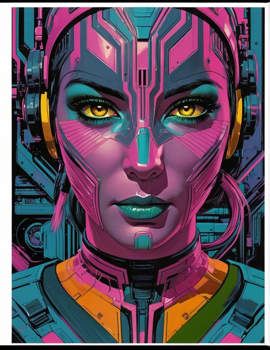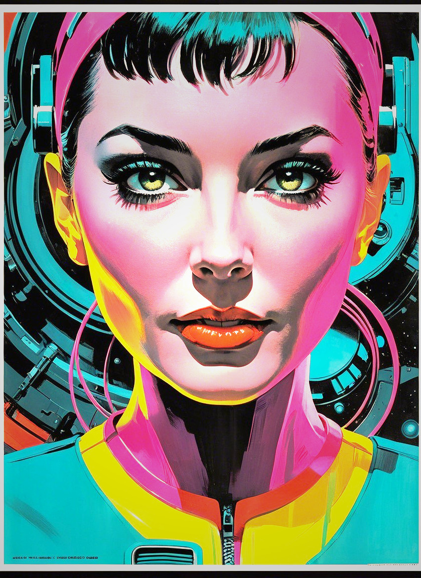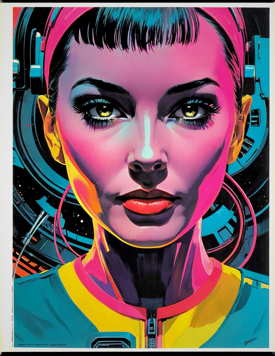 + Prompt:Stylized Art by John Berkey, Science Fiction, 1960s advertising art merged with comic-book art, indiecore 1.6, foampunk 1.3, auracore 1.7, plasticity 1.3, stylized headshot. Subtle minimalist design by Stan Lee, uplifting, accceleration, motion, tempting speed, enticing, attractive, alluring pose, embodiment by Ed Binkley, divisionism, radiance, sci-fi- artwork, fantastical, zentangle linework, stippled, blotted, tesselated, gradient inking colors, hues by Ho Baron, industrial design by Georgia O'Keeffe, lighting by Didier Lourenço and tints by Rosina Wachtmeister, raytraced shadows 1.8, divisionism, plasticity 1.6, dynamic lighting, color shapes, parallax occlusion 1.8, righteous, joyful atmosphere, lively woman's face with multi-layered eyes, gradient inking colors by stan lee, geometrical watercolor and ink sketch with a stylized look, stippled, blotted, and tesselated elements adding orphism for a modern twist,color palette of light-yellow light-blue warm grey, seductive, tantalizing smooth gradients, drudged, masterful use of hues by Ho Baron, serene zen lines, abstract brushstroke art, striking headshot, layered and stylized portraiture by Ed Valigurski, glossy finish, HDR, reflections, rim lighting, parallax occlusion 1.3 inspired by Man Ray, color glitch aesthetics, subsurface scattering 1.2, brightness 1.3, dof, debeh, bokeh, ambient occlusion 1.3, raytraced shadows 1.3, sharp line-art illustration, retrofuturistic details, retropunk reminiscence, feminine, rule of thirds, slightly exaggerated features, anatomical accuracy, abstract sci-fi elements with bold outlining with naive art featuring geometrical 3D effects, linocut by Brock Hofer, black brushstrokes adding depth, dyed by Man Ray, line-art, thick textured layers, contoured, tactile feel, simplistic features, intricate detailing, warm coloring enhancing the fantasy ambiance, detailed vivid coloring and stacked lines, industrial design, sgrafitto reminiscence, parallax occlusion, stacked lines, geometrically structured, smeary,brightness 1.5, visible textures, quaint, fusion of geometrical styles with elements of foampunk, detailed line art to create a whimsical and psychedelic ambiance, traumacore with hatching details and a soft, ethereal atmosphere, fantasy elements, precise execution. Stacked lineage blends elements influenced by Stan Lee and Ho Baron and William Bradley, zentangle shapes, estranged