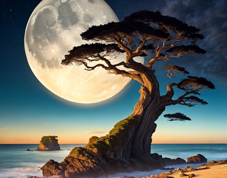 Solitary tree on a beach under a luminous moon