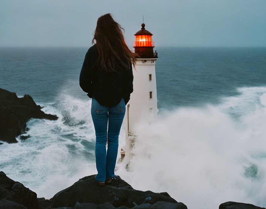 It's not looking good for the lighthouse, as a woman watches the sea engulf a lighthouse. Who put a lighthouse down there, anyway?