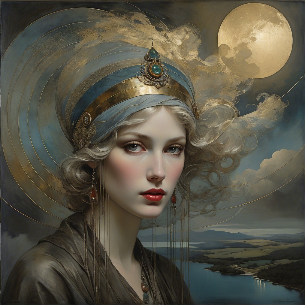 A captivating portrait of a woman with flowing silver hair, adorned in an ornate headdress. She gazes thoughtfully, set against a mystical landscape under a glowing moon.