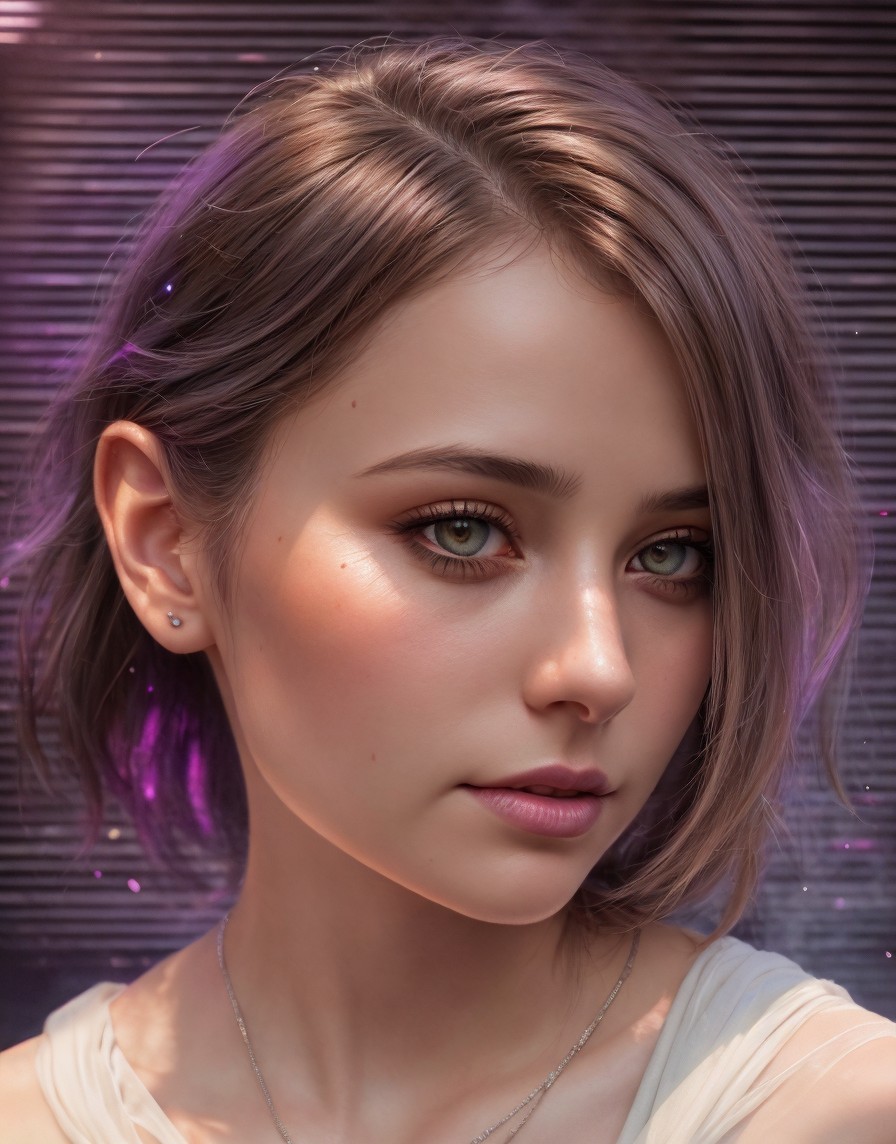 Watercolor and ink portraiture, headshot, textured female face with realistic bioluminescent open eyes, detailed mouth, cinematic lighting, beautiful crisp quality, fantasy style, grain, hues, mist, brushed strokes 1.8, dynamic lighting 1.7, shadow mapping 1.3, wavery texture patchwork, cottagegore 1.7, octane render, color scheme orange purple beige, blended colourful tints of John William Waterhouse and Susan Brack, 3d effects 1.8, chiaroscuro lighting in background,, Ambient occlusion, Octane Render, tints of Devon Rodriguez, anthropomorphic neon art, 3D texture brushlines, HDR, crystalline, translucent details, bioluminiscent edges, back-lit,