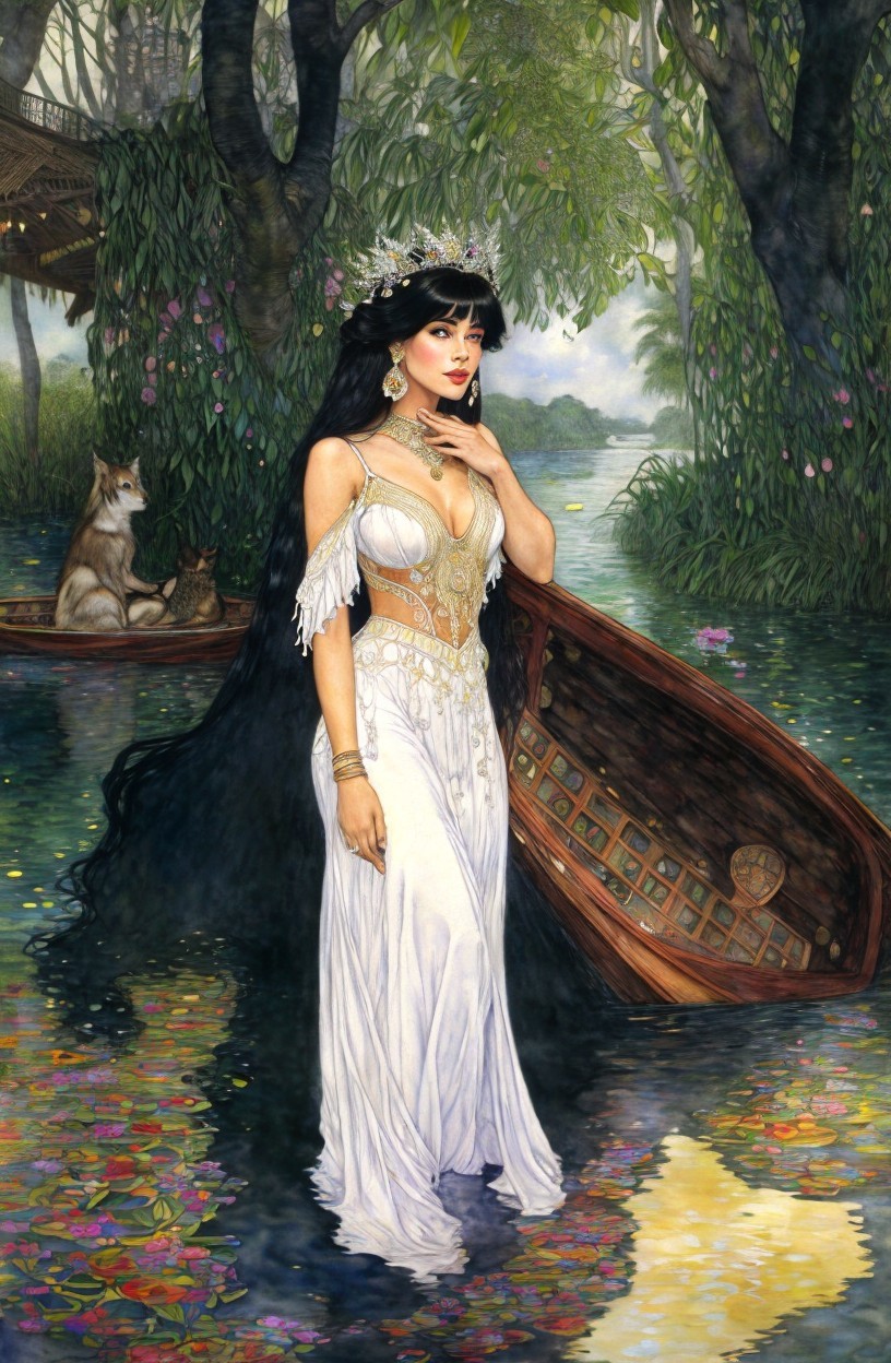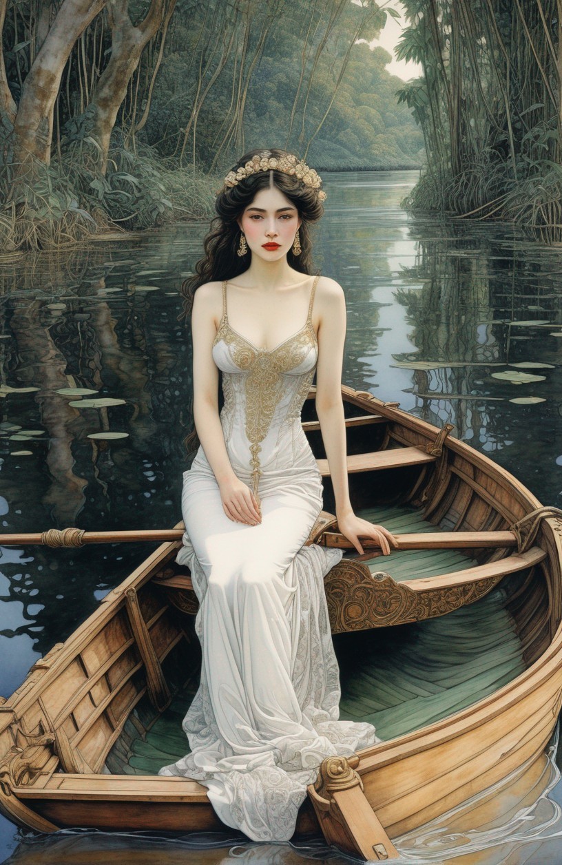A woman in a vintage dress sits in a boat surrounded by lush greenery and water lilies.