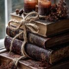 A cozy autumn scene features stacked old books adorned with candles, mini pumpkins, and twigs with red berries. Soft light filters through a window, enhancing the warm, inviting atmosphere.