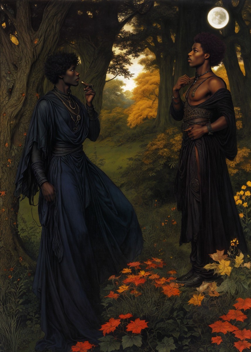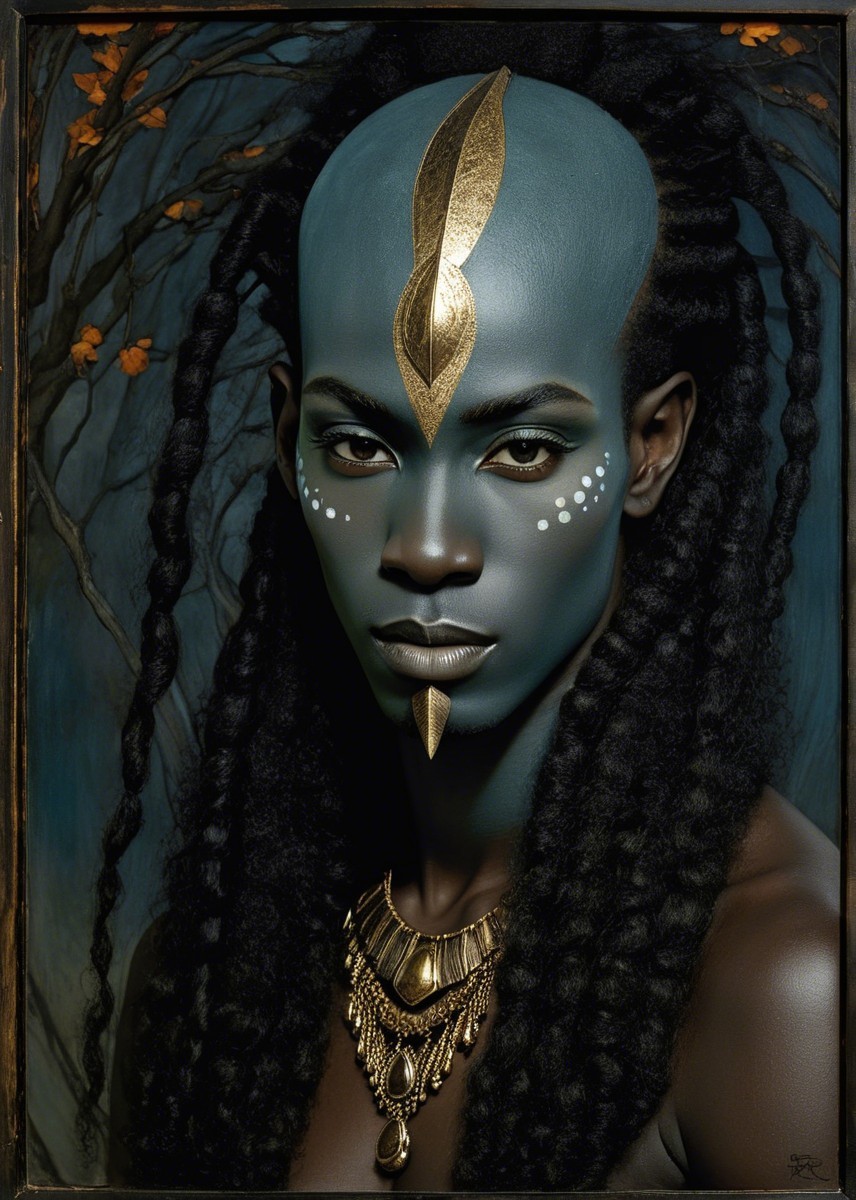 The image features a striking portrait of a young man with dark skin and textured hair, set against a backdrop of autumn leaves, highlighting a serene and introspective expression.