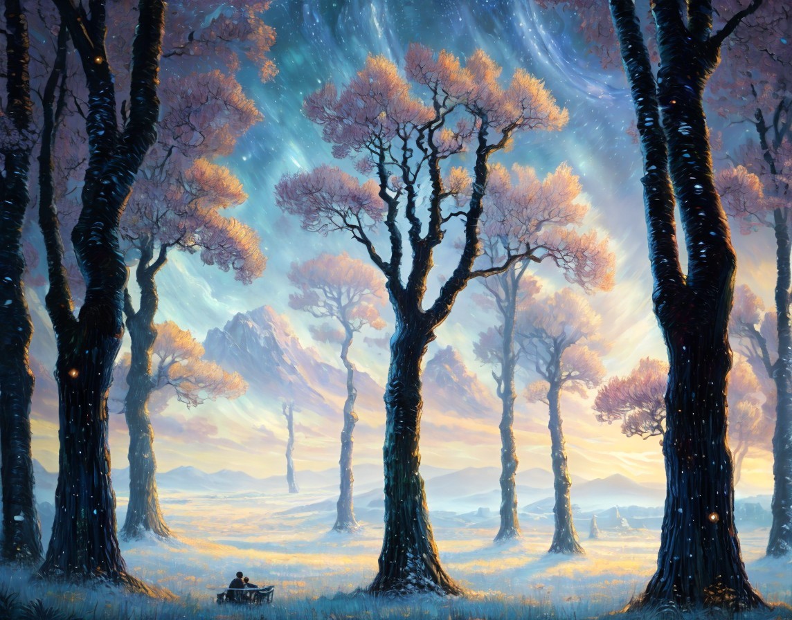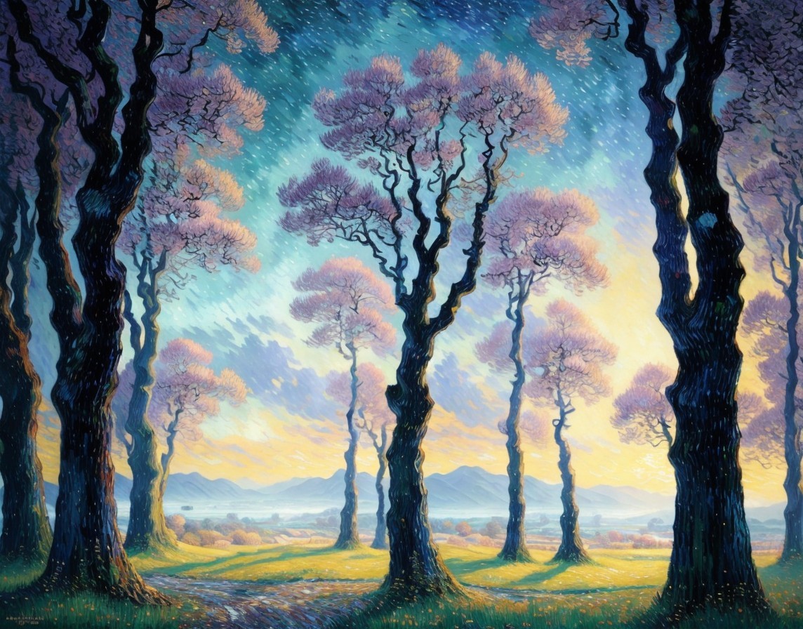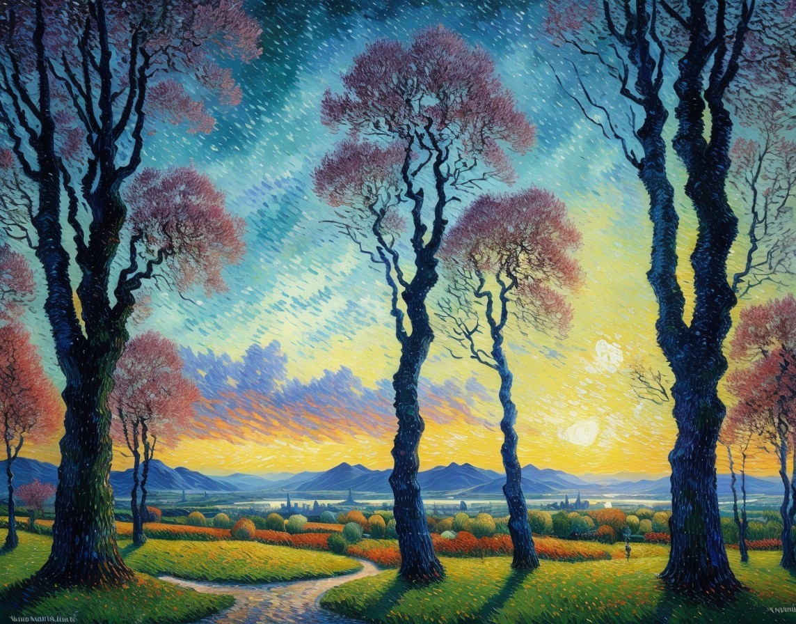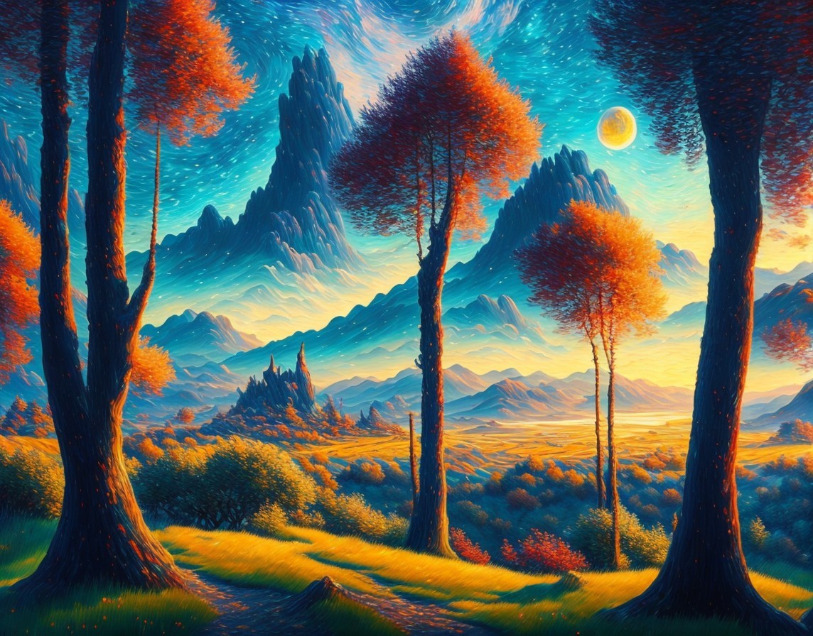 Colorful autumn fantasy landscape with castle, hills, and blue mountain.