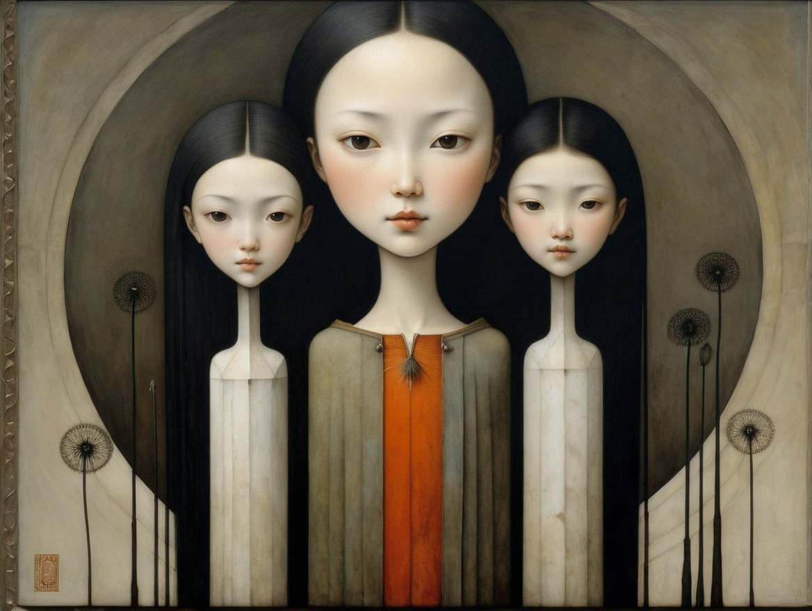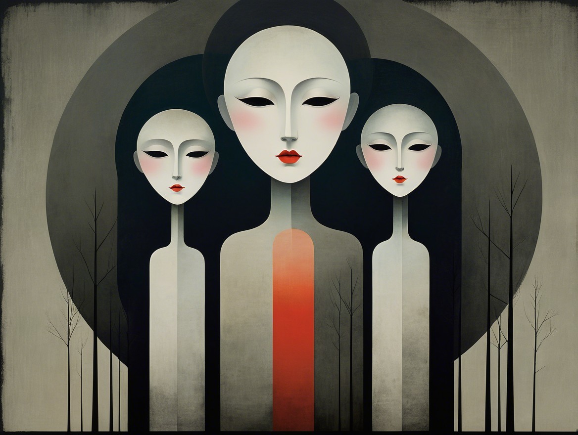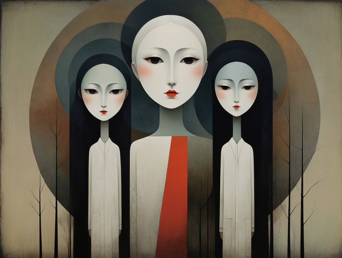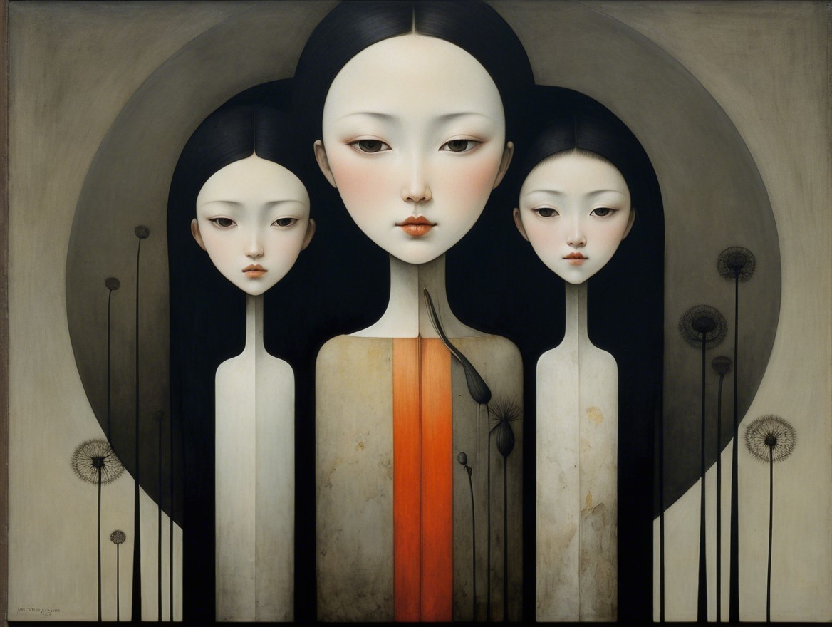 The image features three stylized figures with elongated faces and dark hair, set against a muted background. They have large, expressive eyes and minimalist, ethereal expressions, evoking a surreal atmosphere.