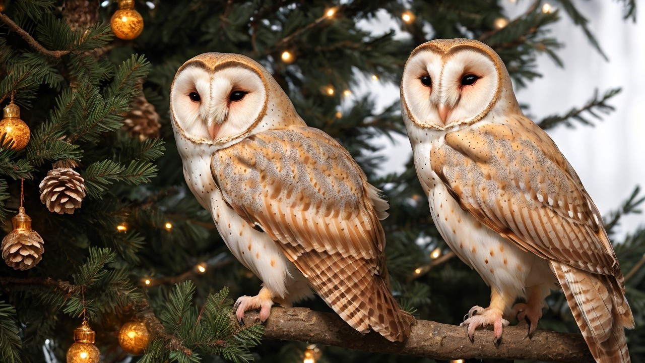 A beautifully detailed illustration of a barn owl perched on a snowy branch, surrounded by leaves and softly falling snow, showcasing its striking white feathers and expressive eyes.
