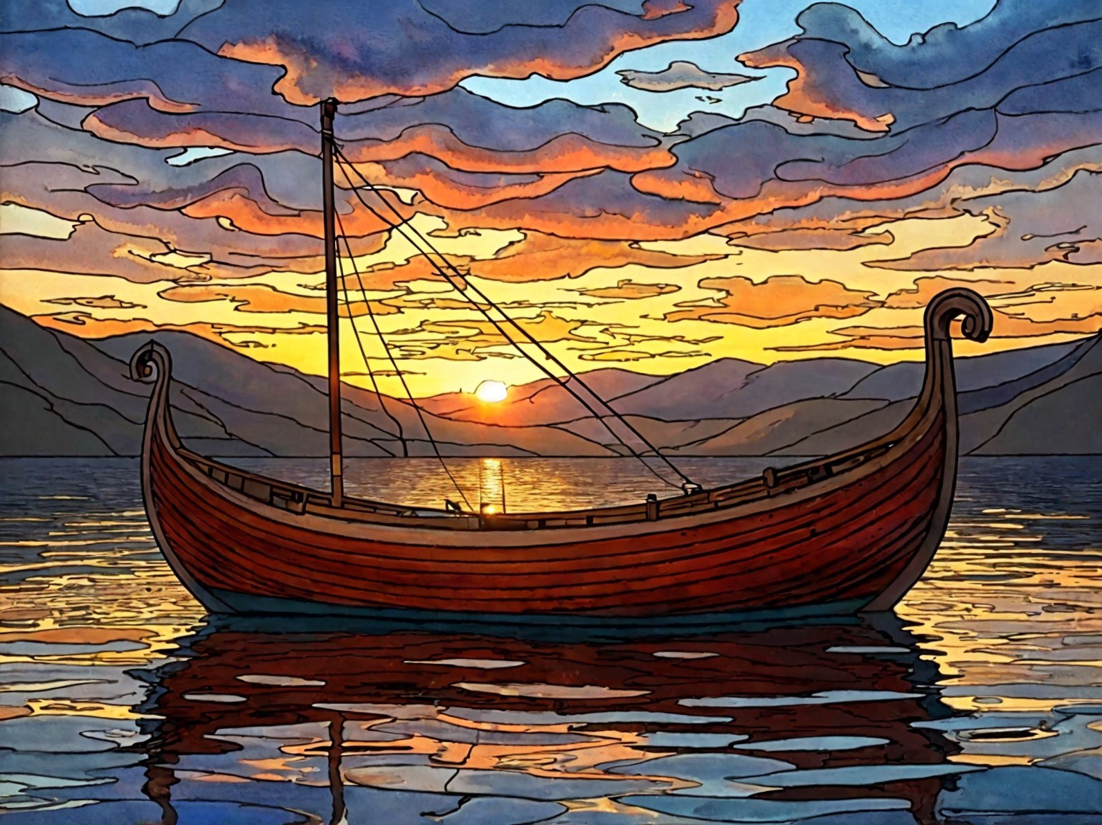 A serene sunset casts vibrant colors over a calm lake, highlighting a majestic boat with a curved prow. The reflections shimmer on the water, creating a tranquil, picturesque scene.