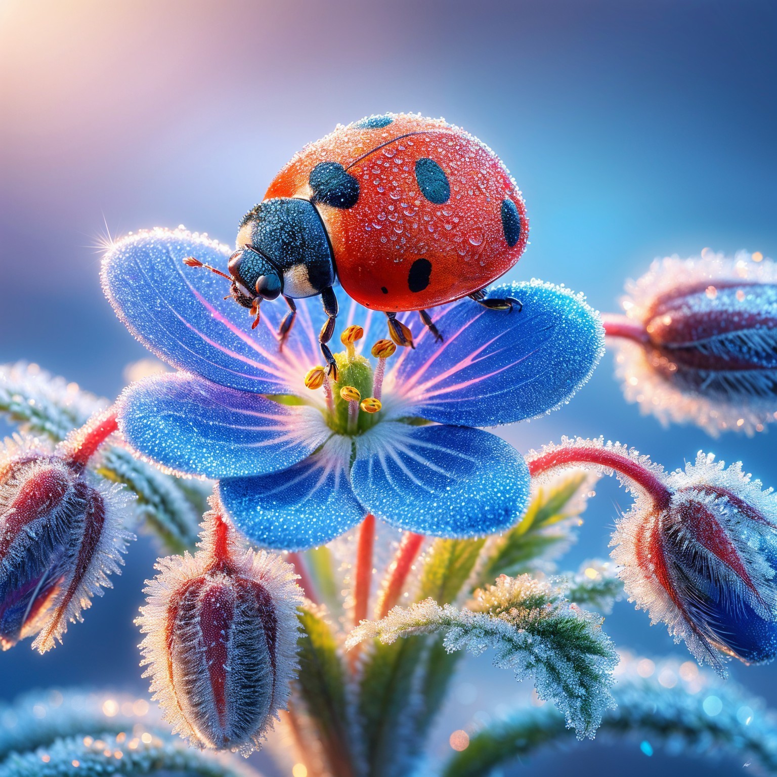 A detailed, super close-up shot of a red ladybug with black spots and tiny moisture droplets on its shell and legs, standing over a vivid blue flower petal. The ladybug's black head and tiny antennae are visible. The blue flower has five petals and yellow stamens in its center