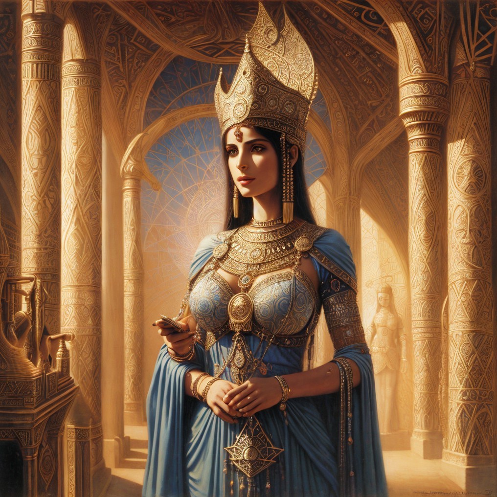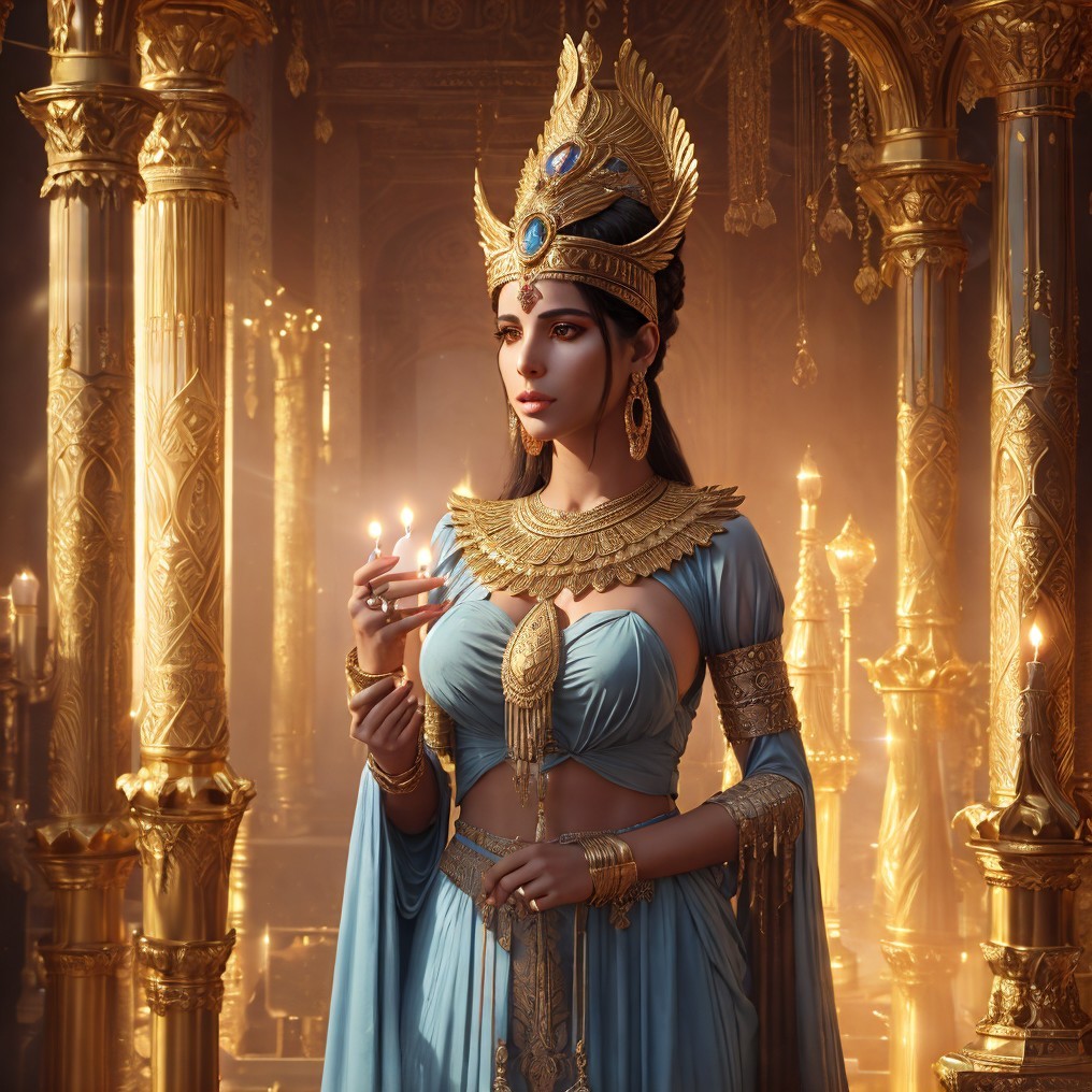 + Prompt:Ishtar. a Sumerian Mesopotamian goddess is standing on the mysterious stage in the spacious hall of the Venice opera theater, burning candles, beautiful intricate bronze candelabras, two owls with glowing eyes are each on the each side of her stand on ancient columns, everything in the golden fog of golden particles, dramatic atmospheric, Gothic, horror, style DeviantArt, hyper realistic, insane, in the style of aurora borealis, sharp focus, double exposure, glossy glass, (masterpiece:1.2), ultra-detailed, (realistic, photorealistic,:1.37), HDR, UHD, science fiction scene, sharp focus, professional, vivid colors