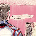 A soldier stands in a room, looking toward a door where a robot figure emerges. The scene captures a moment of anticipation, highlighted by a playful, informal message on the wall behind him.