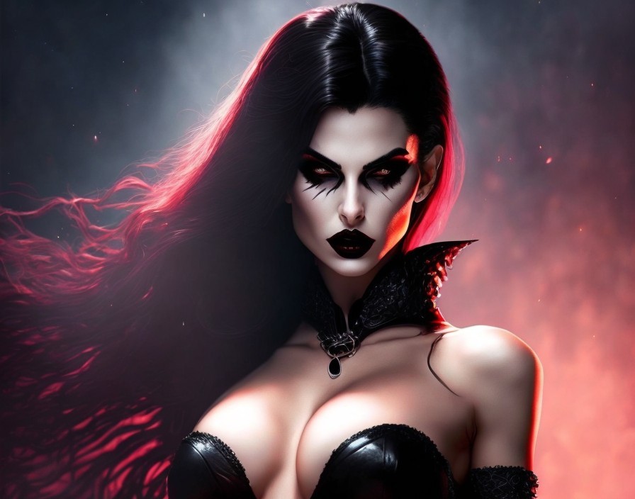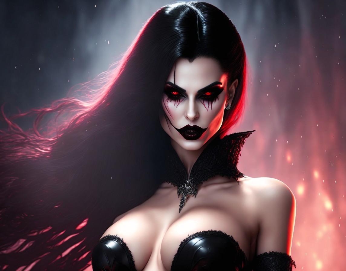 A digital artwork of a female vampire with red eyes, flowing black hair, dark makeup, and a gothic outfit against a fiery backdrop.