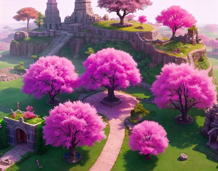 Pink Cherry Blossom Fantasy Landscape with Ancient Tower and Coastal Ruins