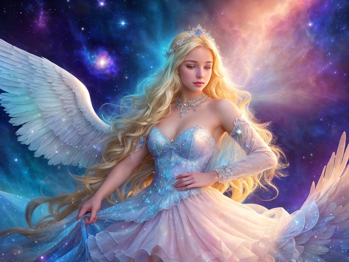 Blonde 18-year-old woman, ethereal beauty, flowing gauzy fairy dress, riding Pegasus, mythical creature, majestic wings, starlit nebula backdrop, cosmic swirls, vibrant galaxies, sparkling stars, dreamlike atmosphere, fantasy realm, surreal setting, celestial journey, magical realism, digital painting, intricate details, soft pastel color palette, luminescent lighting, enchanting and mystical ambiance.