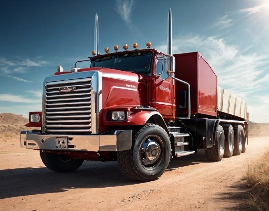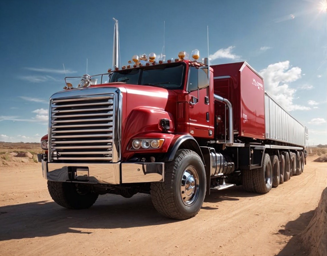 Red Semi-Truck with Multiple Headlights and Large Grille on Dirt Lot