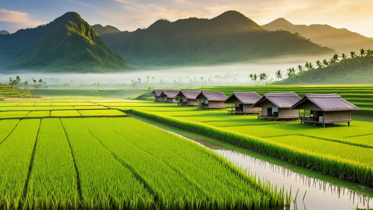 A serene landscape featuring lush green rice fields bordered by wooden huts, set against majestic mountains and misty skies, capturing the tranquility of rural life at sunrise.