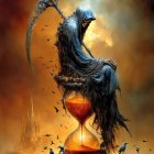 A skeletal figure sits on a throne made of twisted wood, shrouded in darkness. In the background, a towering castle looms against a fiery sunset, creating a haunting, mystical atmosphere.