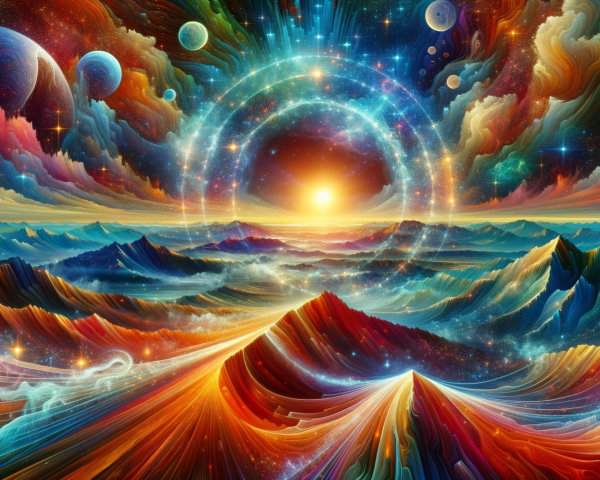 Abajo, en la Tierra, los Hijos de Dios levantan sus miradas llenas de asombro, consciencia y bendición, conectados espiritualmente con Cristo. Sus rostros irradian paz y gratitud, reflejando la unión divina entre el cielo y la Tierra. La escena captura la esencia de la fe y la esperanza cristiana, enmarcándola en un paisaje vasto y etéreo, lleno de colores vibrantes y detalles sutilmente místicos.