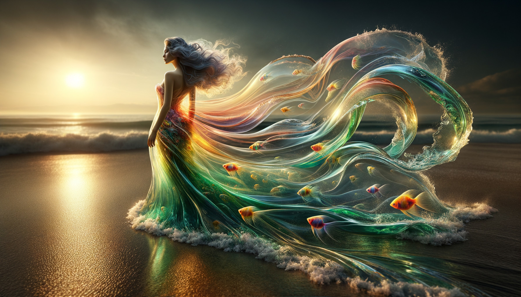 Prompt: Create a hyperrealistic image of a transparent wave shaped like a Beautiful Girl with a colofull dress made out of ocean waves standing at the beach. The clear water displays delicate tropical rainbow fishes within. The intricate details showcase the natural beauty of fishes nature inside, surrounded by the transparency of the glass influenced by the wind and the figure’s movements. Utilize cinematic lighting and detailed textures to highlight the translucent greenish-blue waves. The slightly blurred background contrasts with the warm sunset tones and the blue sky.
