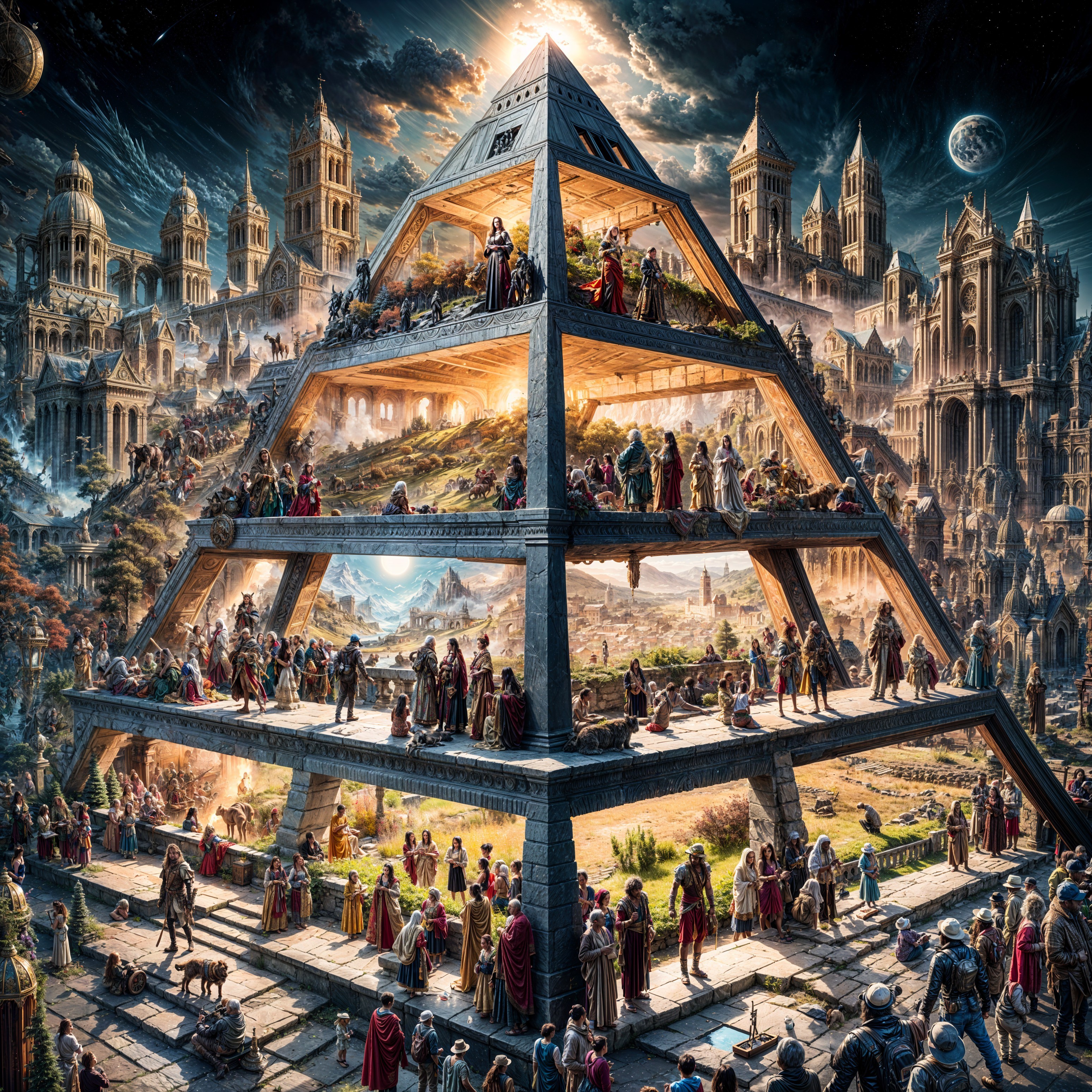 A grand, multi-tiered pyramid surrounded by ancient civilization structures. Crowds gather on each level, illuminated by ethereal light, creating a mystical and vibrant atmosphere.