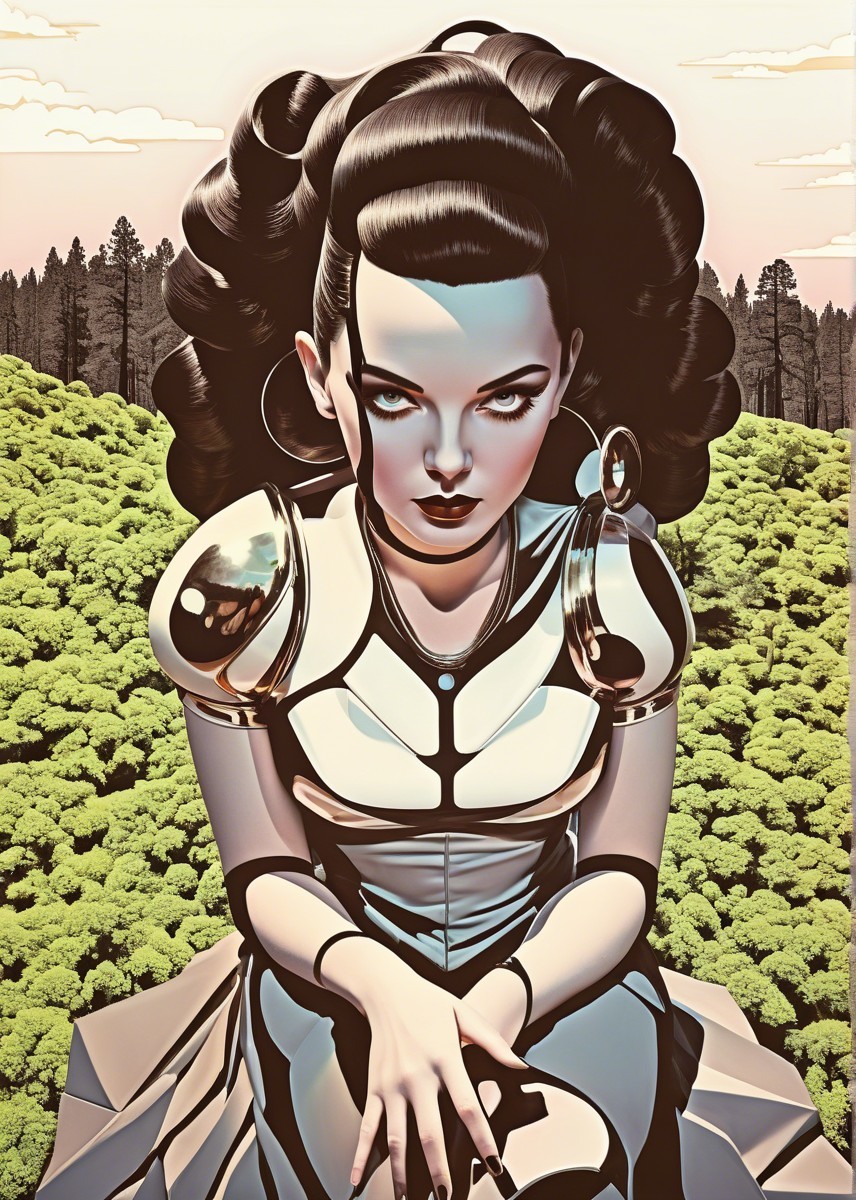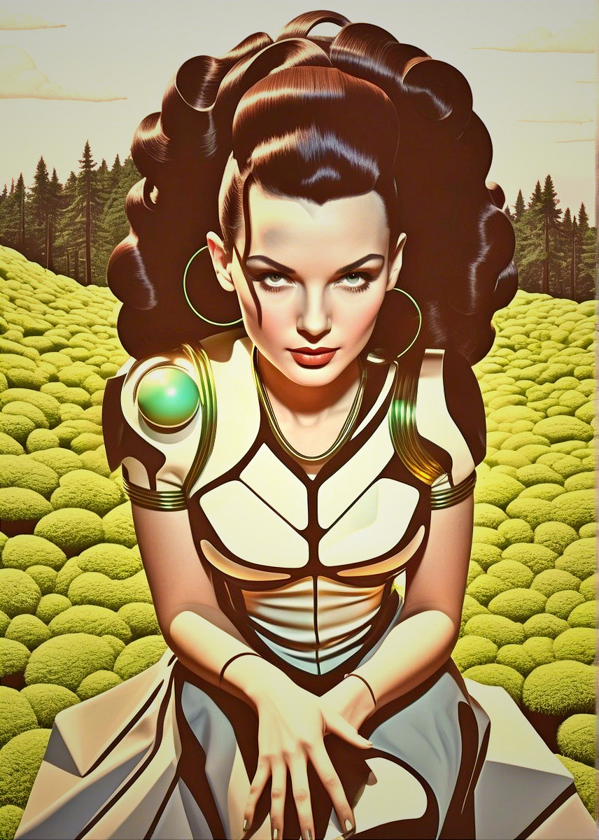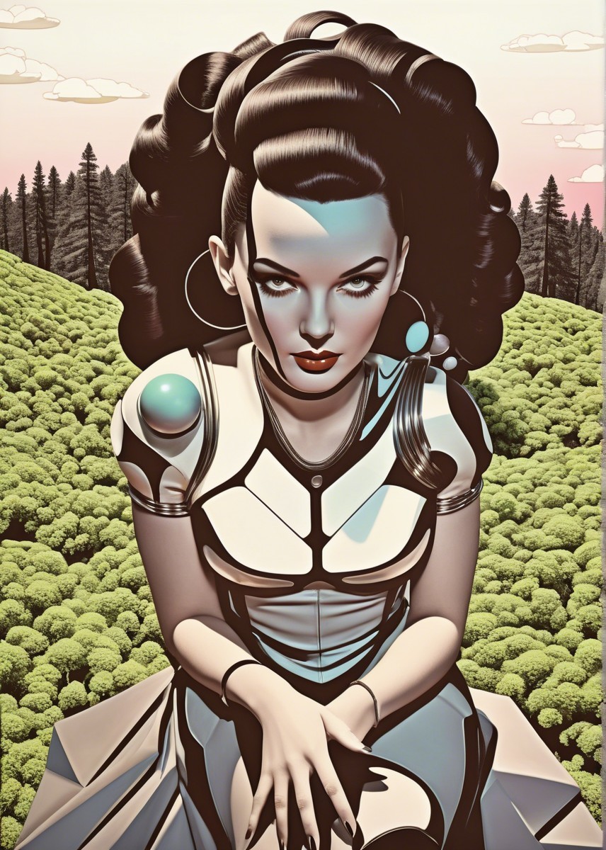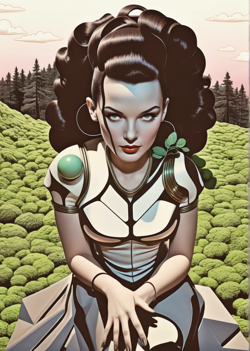 Vibrant surreal line-art, reminiscent of 1960's space-age style, pulp art, dyed, stylized upper body portrait, natural and forestal objects, lawn, roots, moss, simplistic outlined geometrical features, asymmetrical, 3d effects, sculpted, cel-shaded, 3d dynamic lighting, displacement mapping 1.3, shadow mapping 1.3, liminal, phong shading 1.3, texture mapping 1.3, stacked lines, champlevé method, layered hues by William Bradley, warped linocut, dynamic lighting 1.8, VFX-inspired softened lighting, brightness 1.3, infused with a 1970s retro design twist akin to op-art inspired by Georges Seurat and Man Ray, intricate patterns, relaxed, generative patterns with soft edges, perpendicular, only curves and bended linework, subtle visble watercolor textures, warm tones, high coloring, colorful wet-on-wet technique, simplistic, blotting quill pen used for embossed hues by Jackson Pollock, warm 3 point lighting, visible textures by Overton Loyd, quaint, ink and a scratching style, chiseled, multi-layered eyes. Several transparent crystal-clear layers. parallax occlusion 1.8, uhd, hdr, dof, debeh, bokeh, emulsion shifts, dyed, trippy coloring, detailed swirls, cymatics, geometrical catenaries, splashes, spirals, linework, organic textures by Dan Mumford and Frank Frazetta, natural asymmetry, painterly effects, visible porcelain skin texture, displacement mapping, plasmatic hatchings, scratched edges, cel-shaded lighting is soft and diffused, highlighting the delicate features and fabric textures. 3d effects, layered shapes, raytraced shadows 1.4, crayon art reminiscence, hdr, uhd, contouring outlines, subsurface scattering 1.6, pointillism theme, Ho Baron inspired, overflowing with visual density, trippy, warm-toned, very colorful,plasticity 1.9, brightness 1.3, zentangle, swirls, cymatics, surrounded by flares, vibrant color palette, catenaries, complex swirls, asymmetrical cymatics, wavery organic forms, micro-pen lineage, line-art detailing, stippling, push processing technique, post-avantgarde style, fine-line illustration, natural color gradient inking, raytraced shadows, 3D effects, comic book cover art,