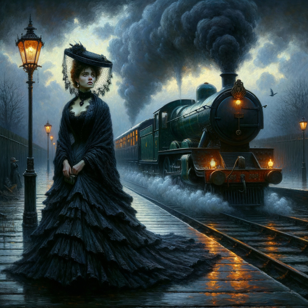 A mysterious woman in a dramatic black dress stands by a vintage train station. Steam billows from the locomotive, and gas lamps cast a soft glow in the misty atmosphere, evoking a gothic vibe.