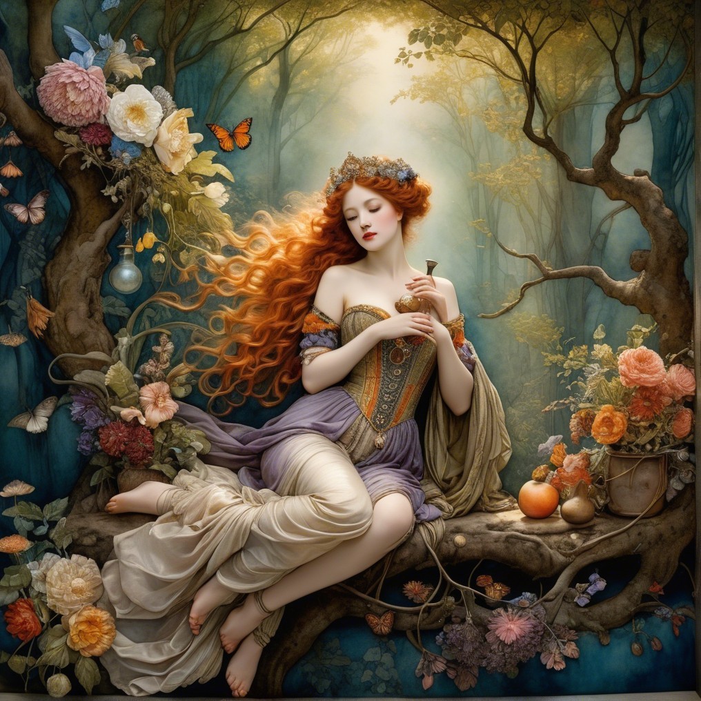 A woman with flowing red hair sits gracefully among ornate glass bottles in a sunlit, fantasy-inspired setting, exuding an ethereal charm reminiscent of a fragrant apothecary.