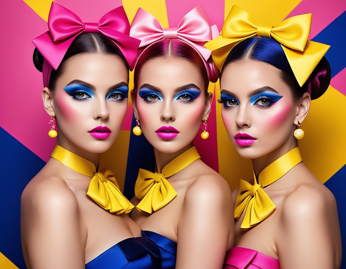 Three glamorous women pose side by side, each with bold makeup and vibrant hairstyles. They wear matching colorful bows and elegant accessories against a bright geometric background.