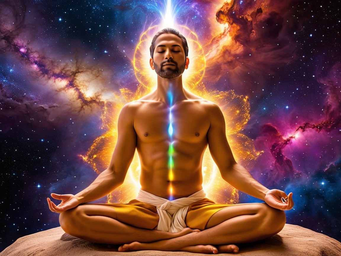 A radiant being in deep meditation channels a powerful surge of energy, with vibrant chakras glowing like galaxies. The scene is filled with cosmic light, sacred geometry, and a divine presence, evoking enlightenment.