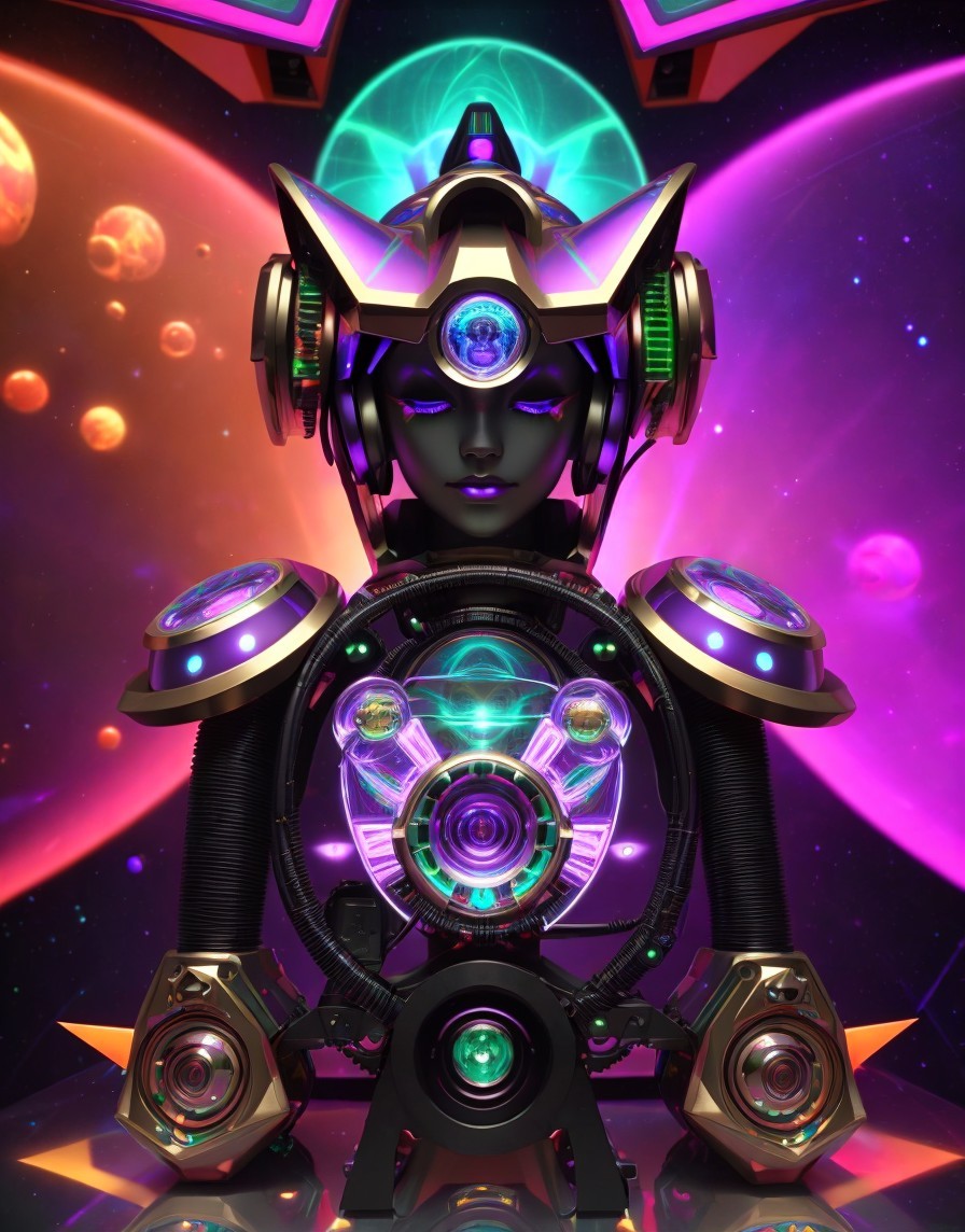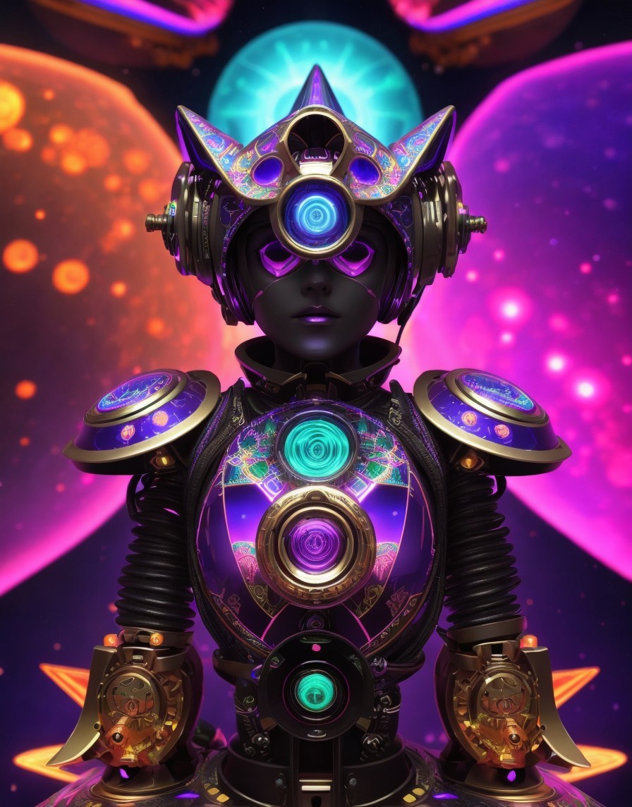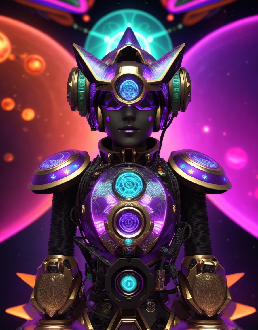 Prompt: "Dmt hyperspace virtual reality machine-elf jester figure Escher mechanical ai - energy -demon mind bending weird circuit board patterns dark space background"
