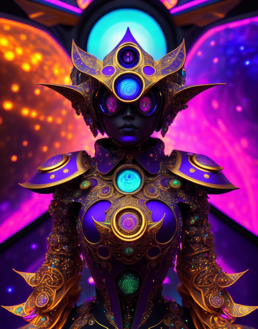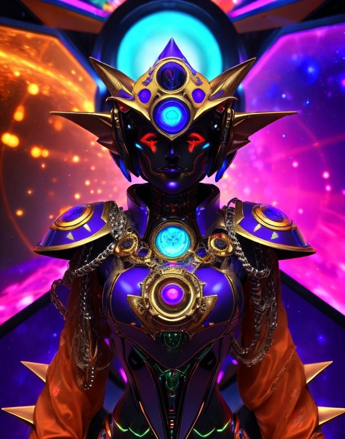 Prompt: Dmt hyperspace virtual reality machine-elf jester figure Escher mechanical ai - energy -demon mind bending weird circuit board patterns dark space background