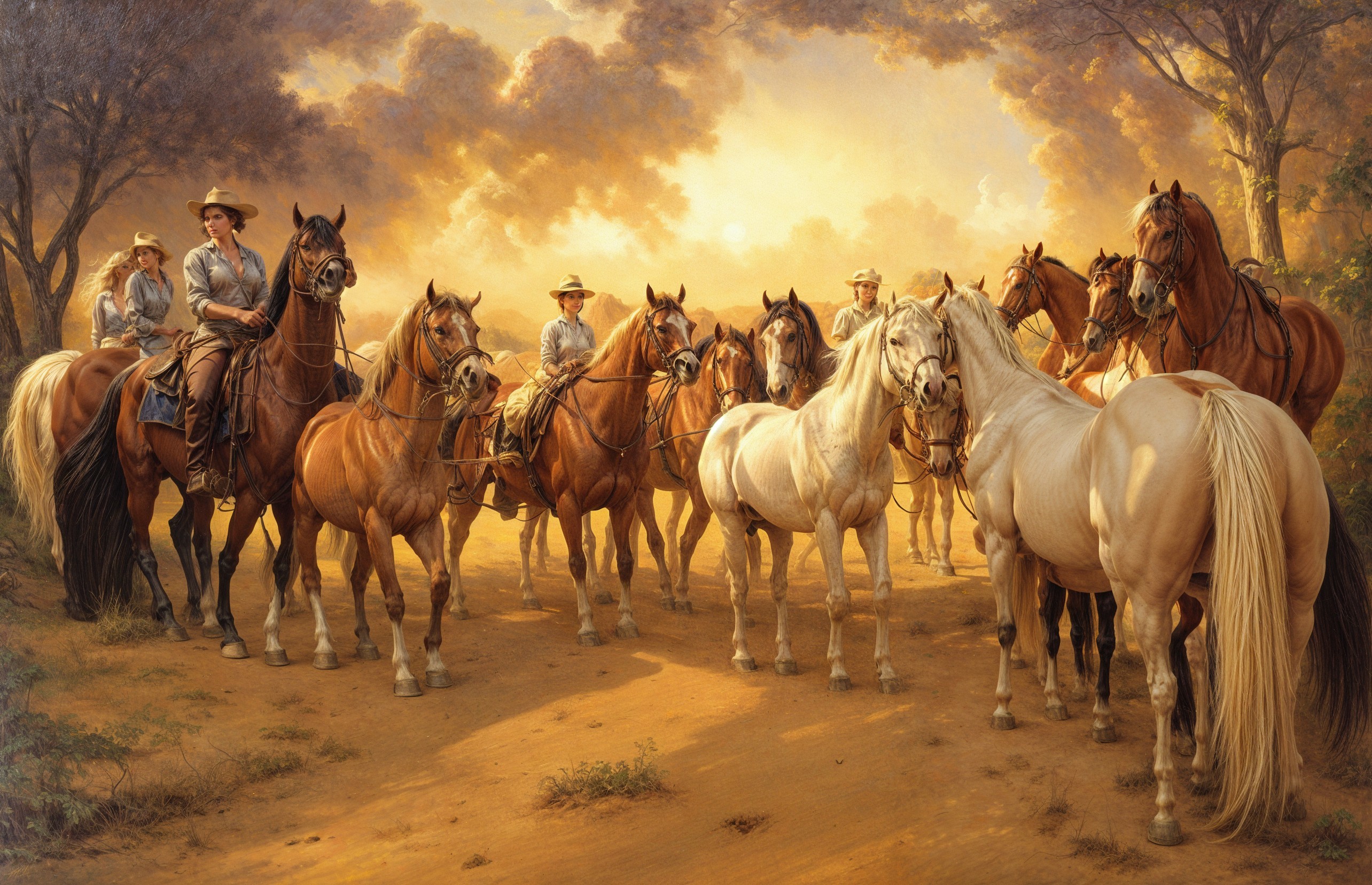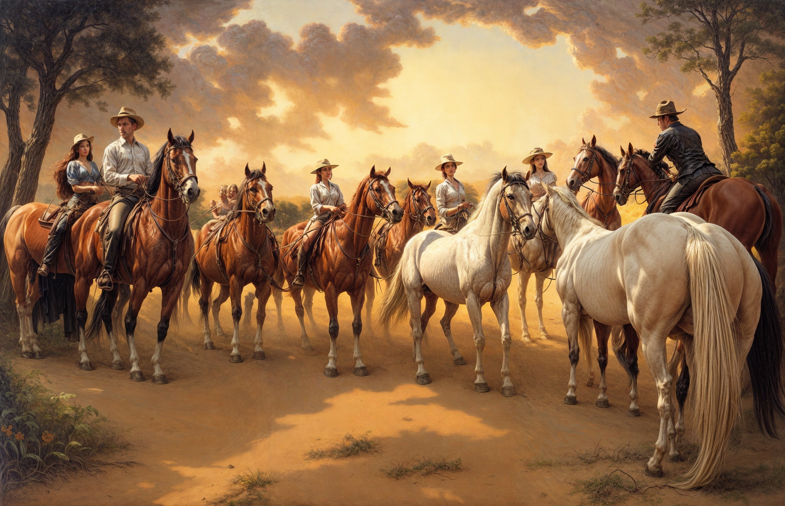 A group of riders, dressed in hats and casual attire, gather on horseback in a serene landscape at dusk. They are surrounded by beautiful horses, with a warm sunset casting golden light.